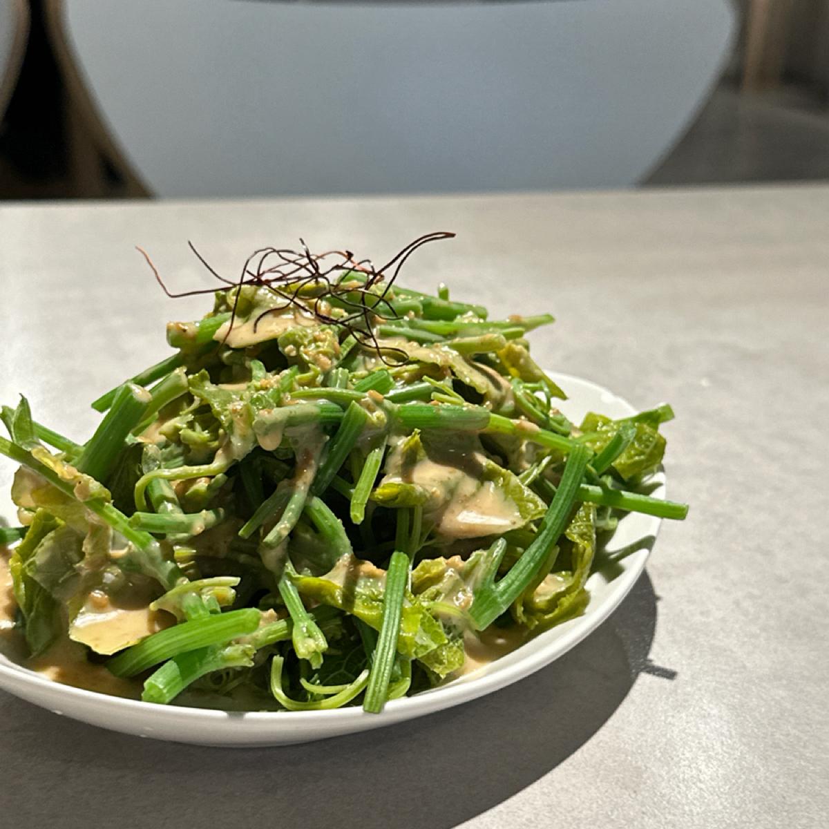 アスパラガスがとても美味しいです。生のアスパラガスの葉をゴマソースと合わせて食べると、とても美味しいです。二人で食べるのがおすすめです。