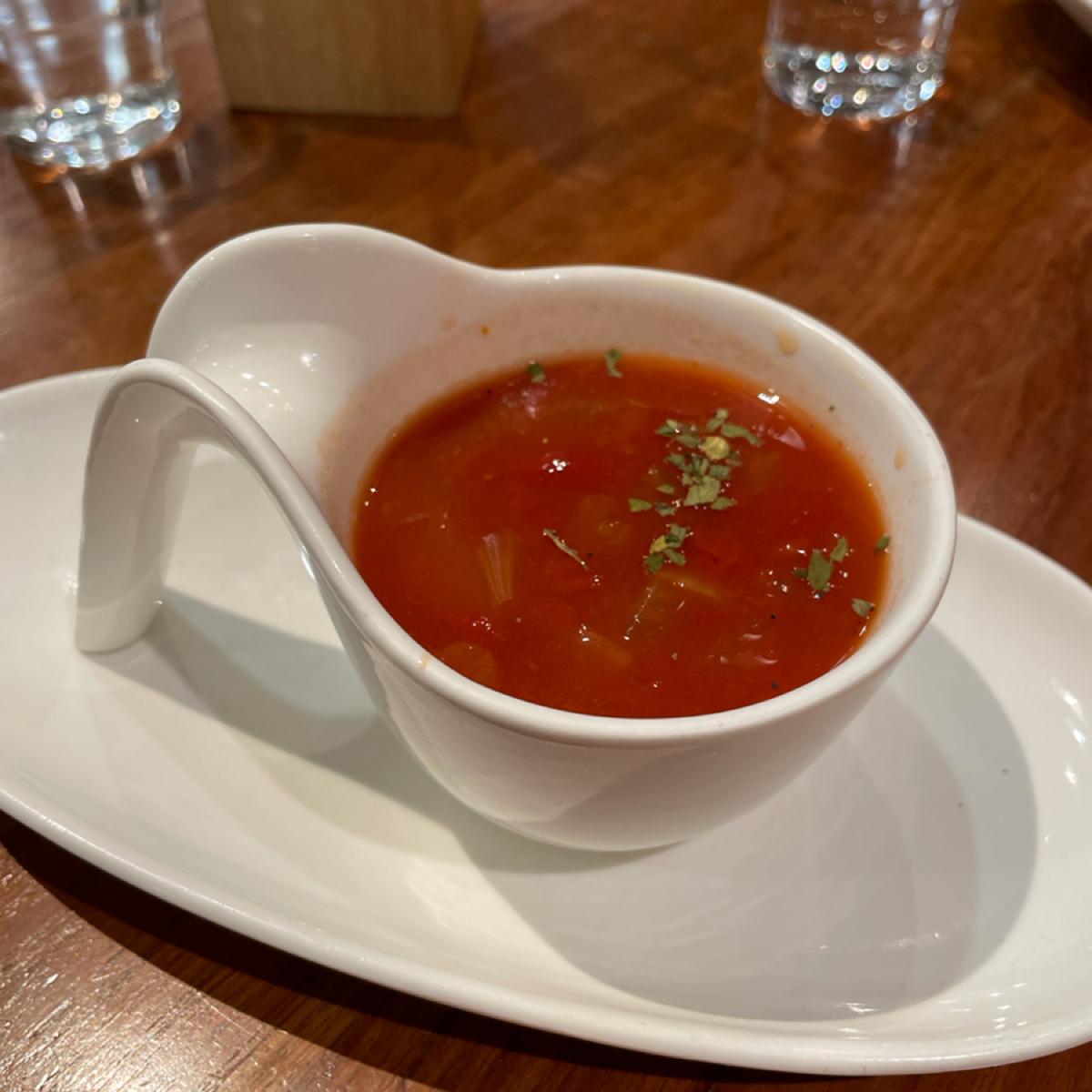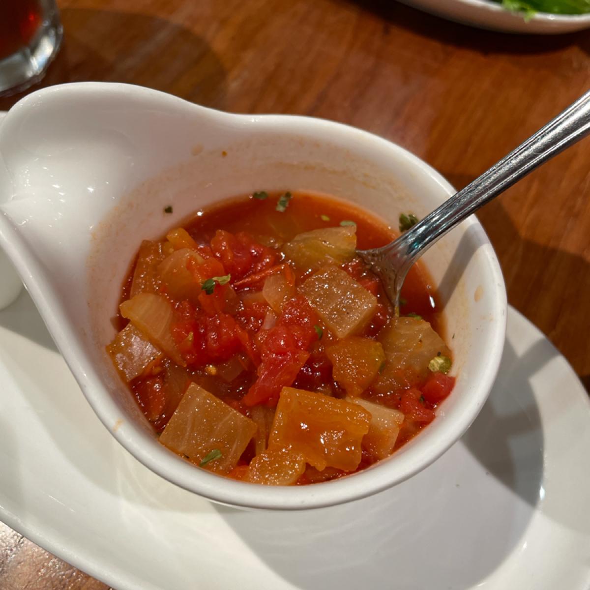 トマトと野菜のスープは、小鉢なのでただの砂糖水ではなく、野菜がたっぷり入っていて、トマト煮の酸味もありとても食欲をそそります。