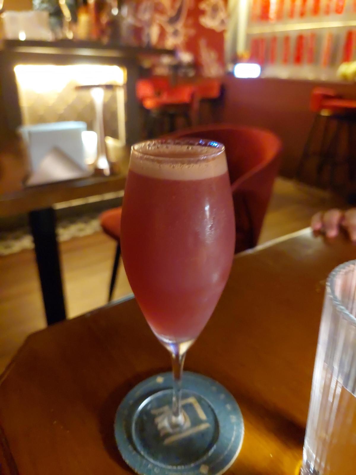 這是一款以琴酒為基底的創意調酒,一開始是由放在煙霧內的玻璃罩送上桌,開啟的瞬間,裊裊煙霧帶出了外觀迷人的紫藍色澤酒體。