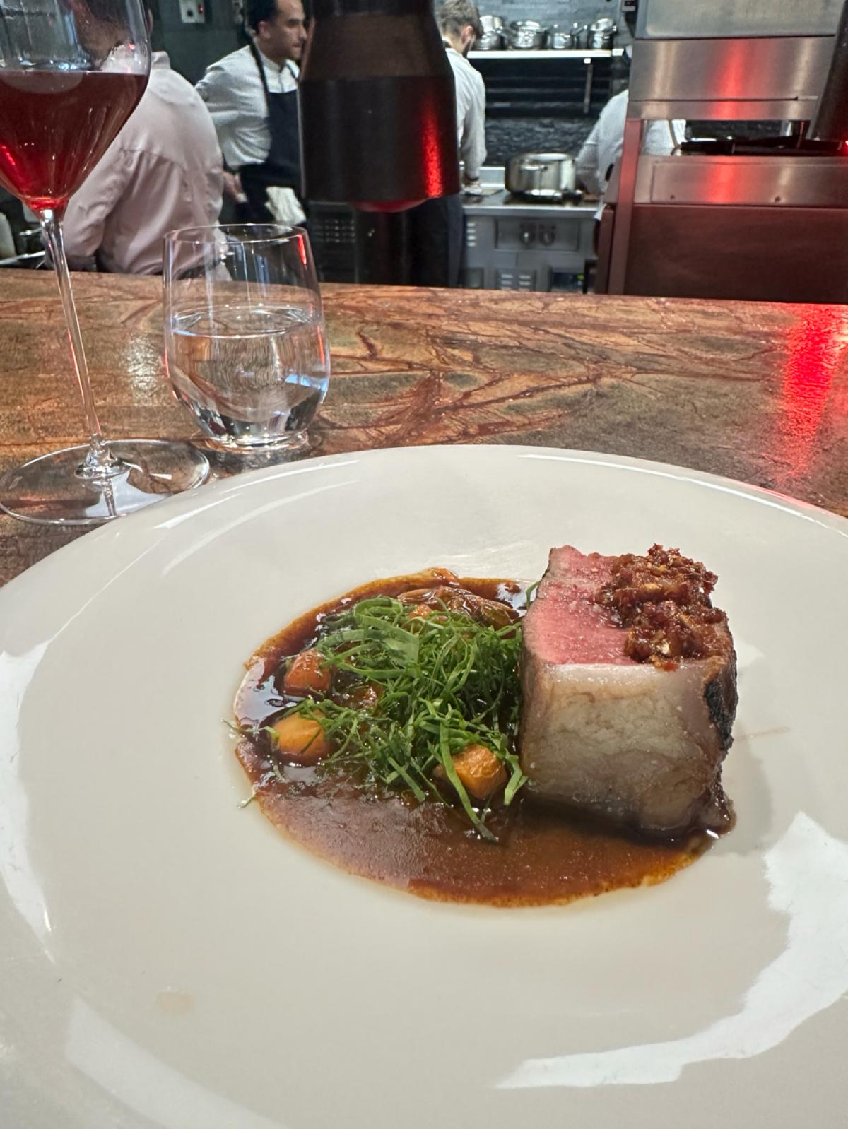 進到餐廳時,其實我早到了~他們尚未準備好位置,所以先將我們安置在旁邊的座位,後來才帶我們到位置上,點餐方式也有些不一樣,一般在美國都會先跑來問問要喝些什麼,但是這邊會先問三種菜單要哪一種~ 然後才來問配酒🍷但一切服務都很到位, 讓人感覺很舒服!而且是開放式廚房,可以體驗到廚師們認真做菜的樣子!