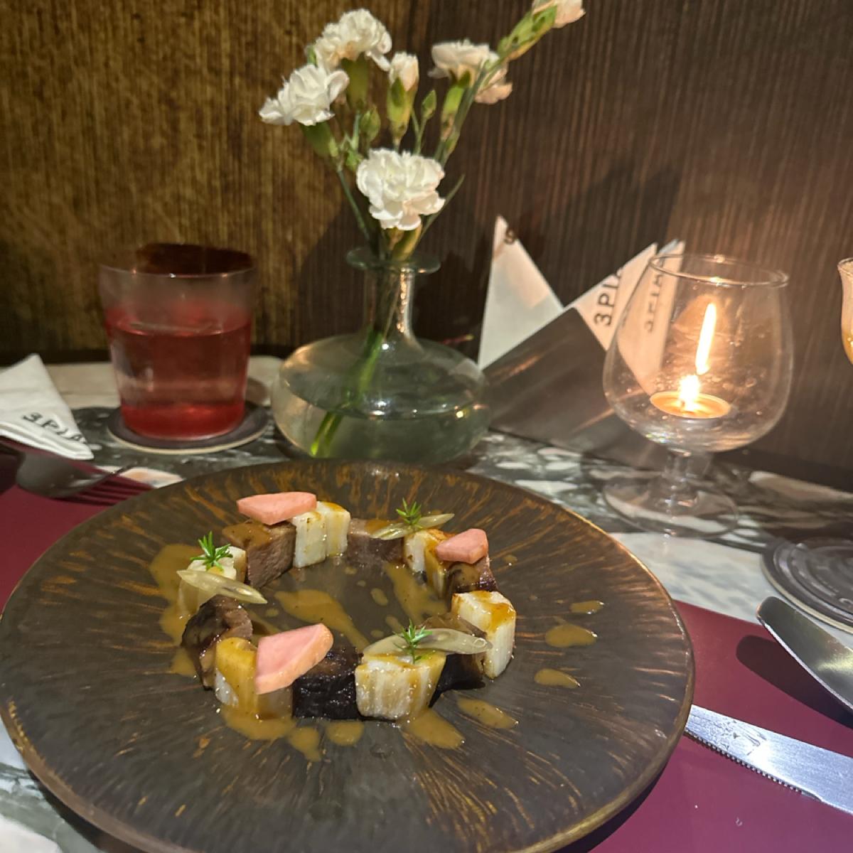 這道完全是美味加上視覺饗宴..上來的時候還在類似小烤爐的餐具上,很特別的是牛肉下面搭配的是茄子🍆從來沒有想到過完來牛肉配上茄子還有廚師🧑🍳創造出來的醬汁, 可以這麼好吃!鹹味帶有一點甜把茄子的味道稍微壓制..把牛肉的軟嫩和香味更帶到另外一個層次!