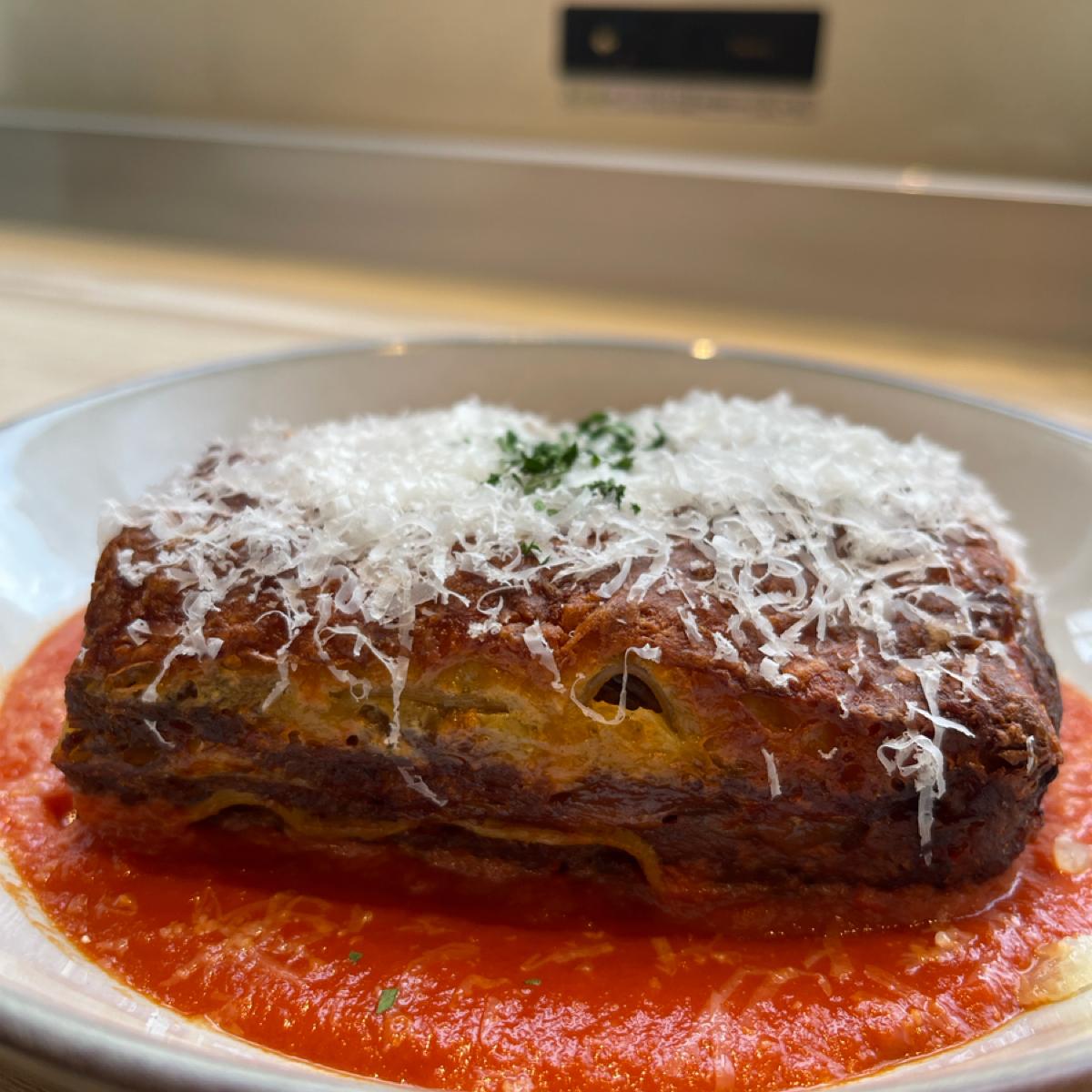 起司烤得很脆 導致刀子不好切成一口大小🤣