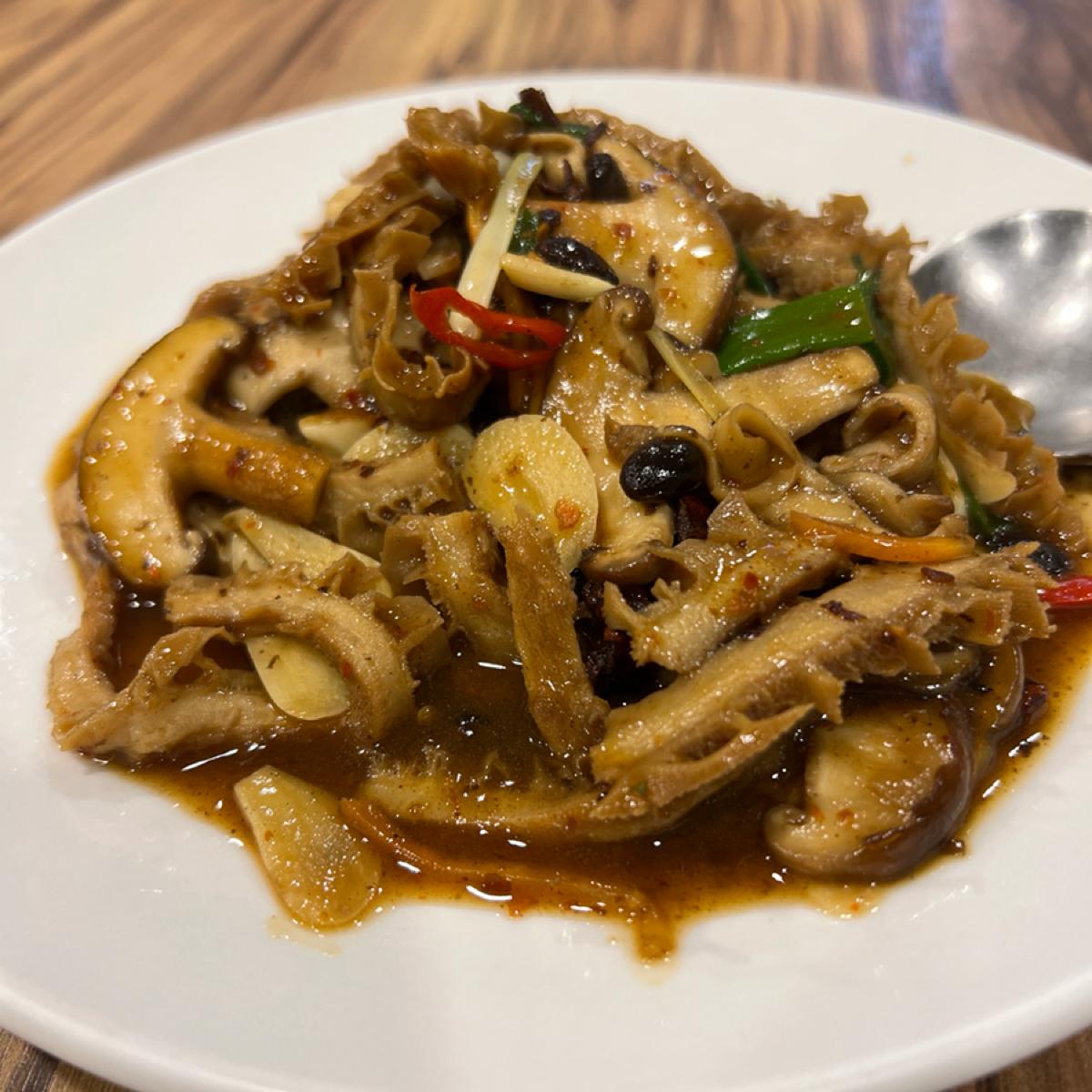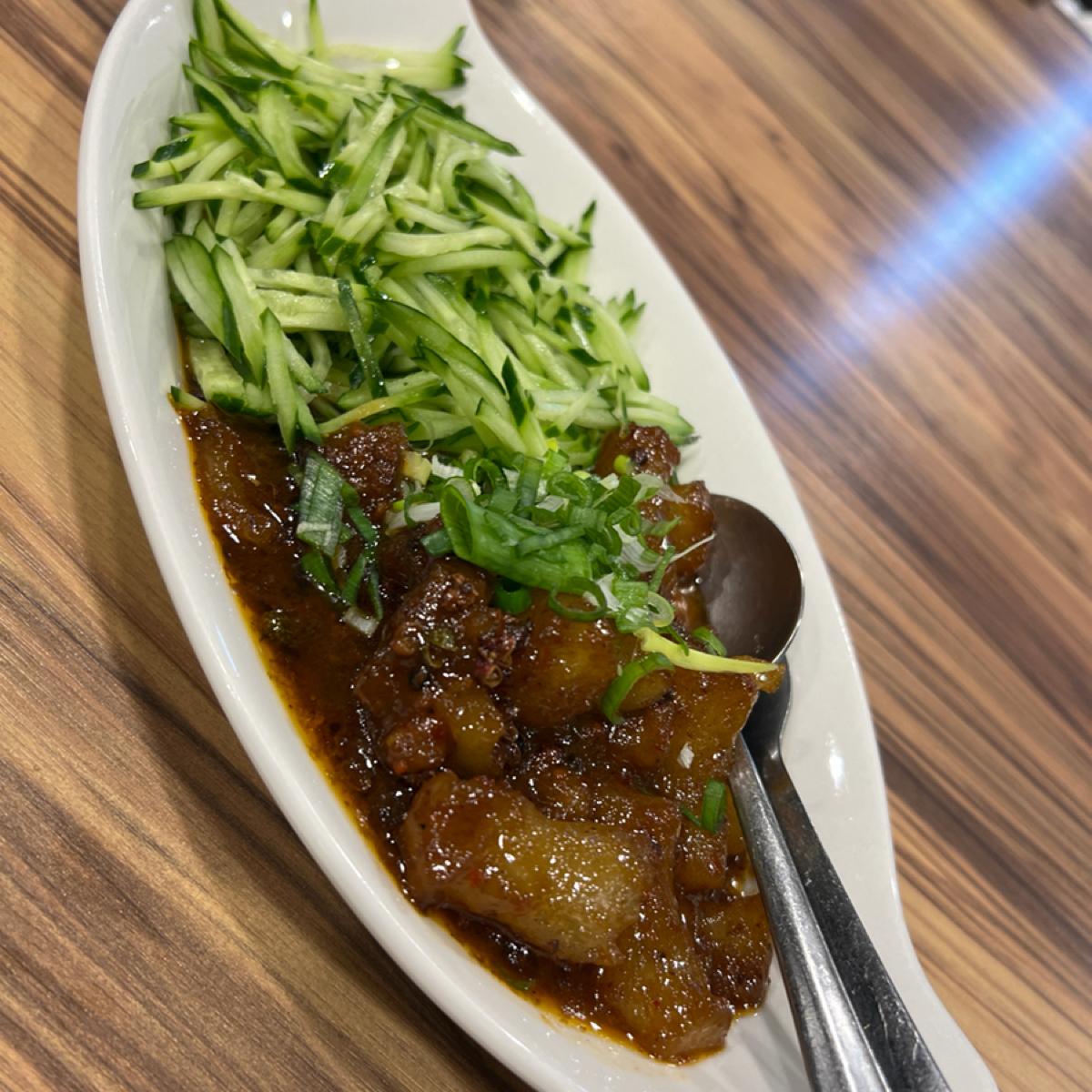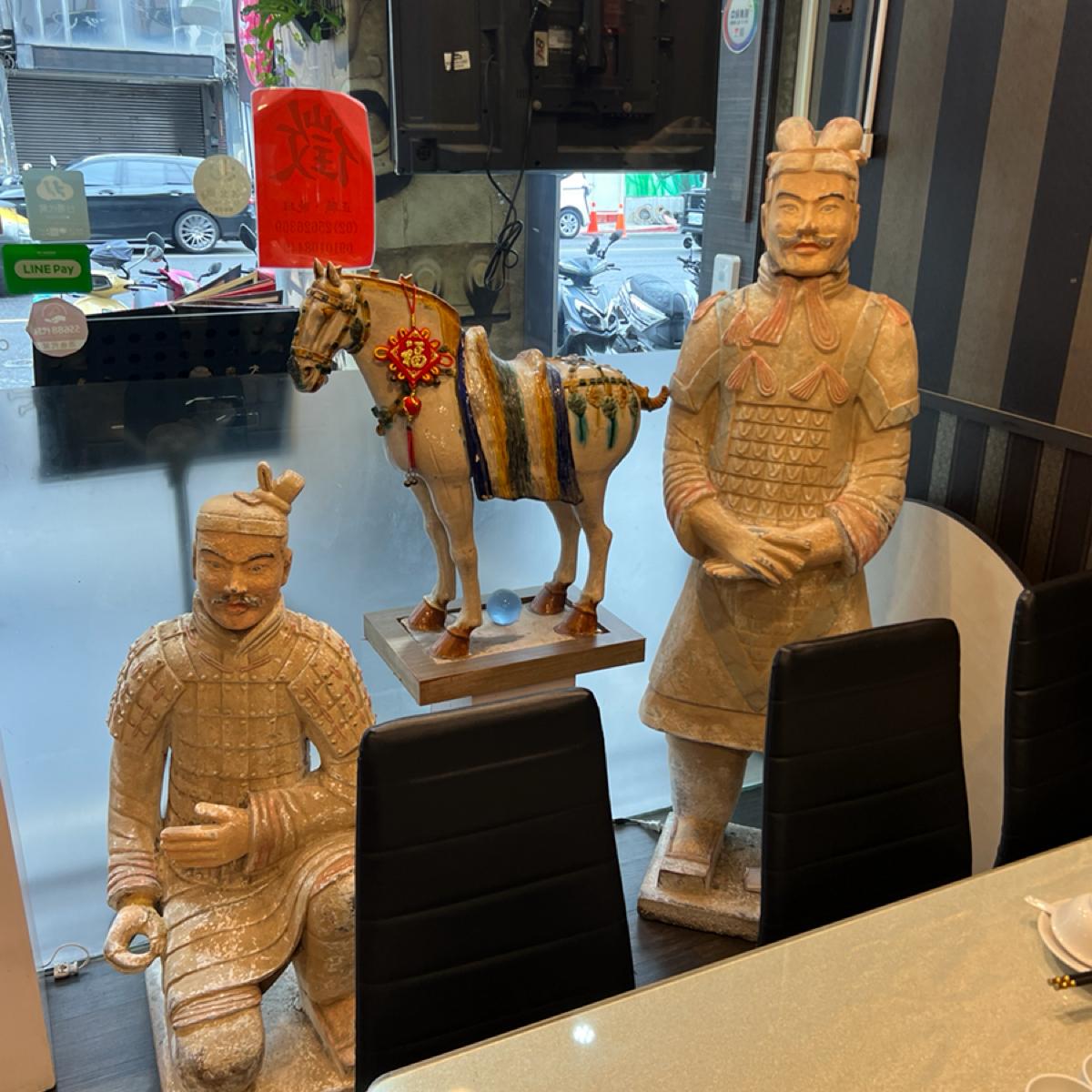 二樓有可以坐15個人的大圓桌非常的不錯好像還可以唱歌。感覺應該開了好幾年了但是環境算乾淨舒適,擺設都很陝西風,還有兵馬俑超酷的啊。 我們大大小小15人吃的非常飽餐點都很有特色,只是一樓客滿2樓有2桌客人所以上菜比較慢一點,羊肉串、蹄筋、大盤雞、羊肉湯還有奶酥豆腐都很好吃很夠味,道不道地我是不知道但是好吃是真的,也可以唱歌喝酒很棒。