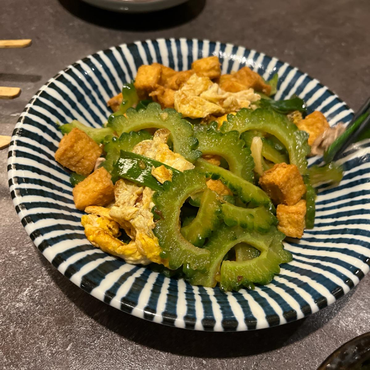 先上桌的是生啤酒,冰涼順口,泡沫細緻,是居酒屋裡最不會出錯的開場。配著酒先吃苦瓜炒蛋,苦瓜處理得不錯,苦味不會太強,搭配蛋香後反而顯得清爽,很適合在油香較重的串燒之間當作轉換味覺的角色。