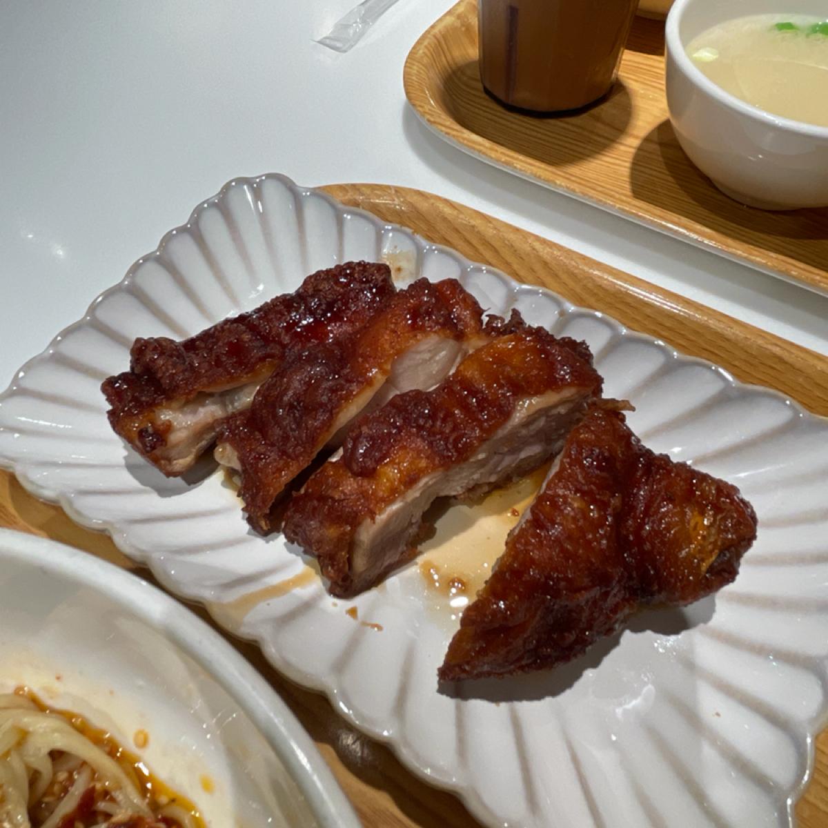 今天選的餐點是「泰酥雞腿排椒麻乾拌拉麵」,麵條裹著泰式醬汁,酸甜合適,辣度只有微辣左右,很香蠻好吃~裡面有搭上豬皮,增添不一樣的口感~炸雞腿的部分是去骨雞腿排,有先醃過再炸,外皮酥酥脆脆,調味也很不錯!