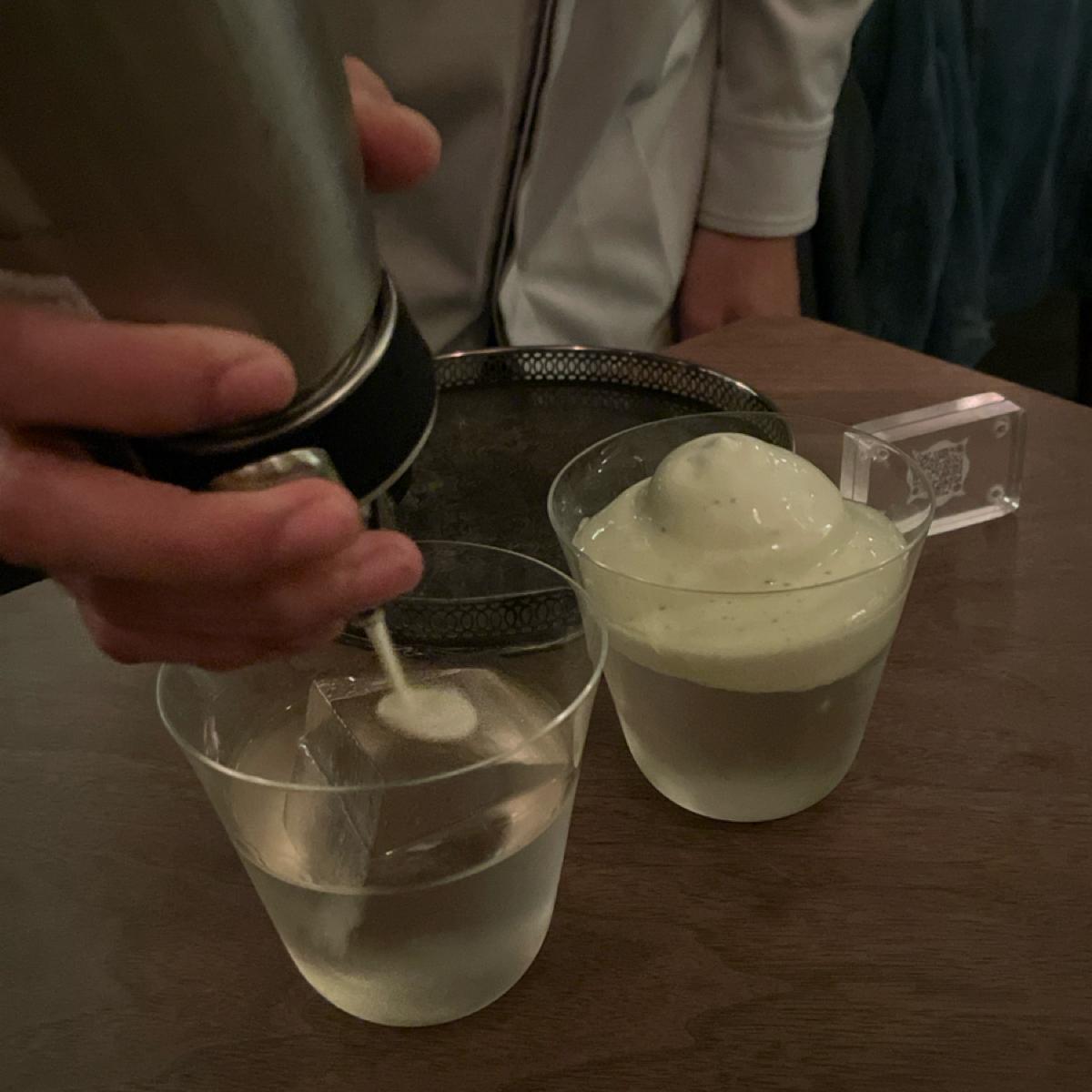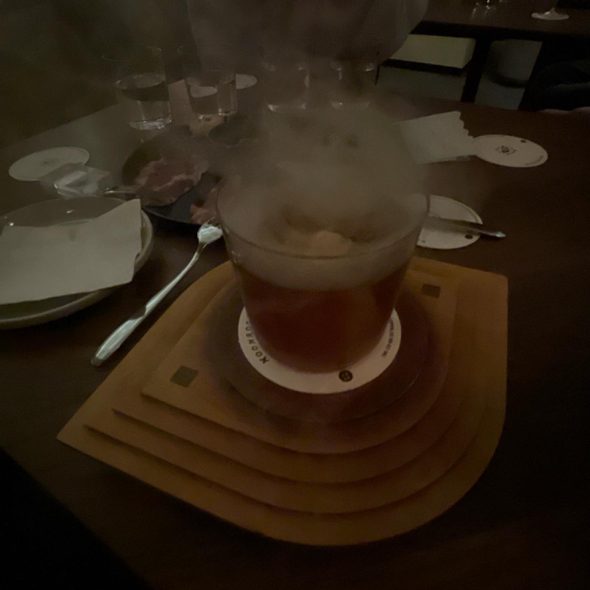 我的第一杯是暈漫,喝起來偏甜是感覺女生都會喜歡的類型,上面的泡泡也是我在調酒沒喝過的。印象最深刻的是本事,剛上桌的時候還有一個蓋子打開後很多煙,是一杯視覺味覺兼具的調酒,工作人員說用了威士忌有較重的酒感,我喝起來覺得有酒感還是蠻順的,有胡椒味(?),是我喝過很特別的調酒。