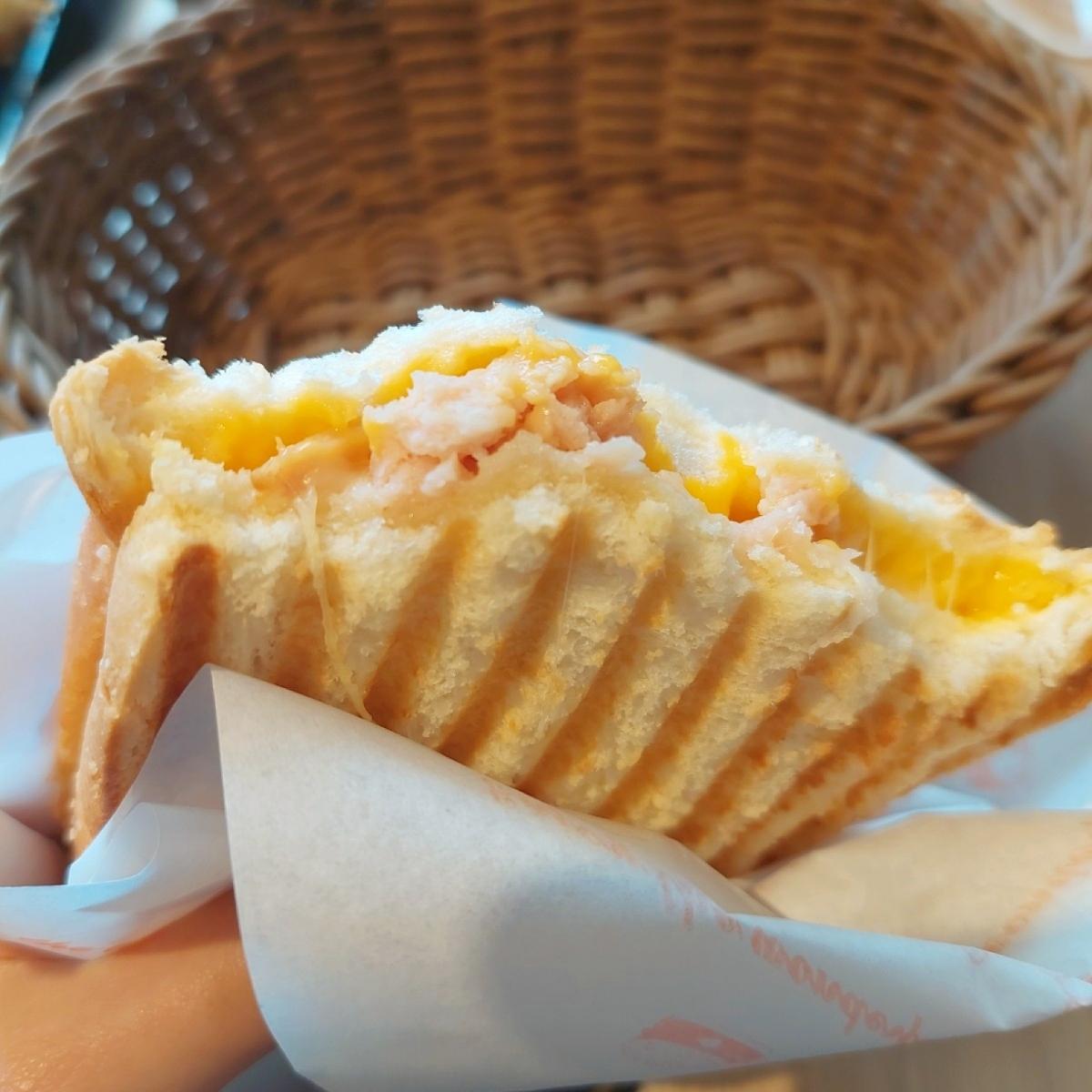 熱熔山型起司燻雞麵包,整體吃起來蠻好吃的,吐司外皮更加酥脆,吃到最後有些偏鹹,起司會拉絲,但料偏少,咬起來有點不過癮,在這個價位我覺得還行,只吃這一個可能不會飽,大概5分飽。