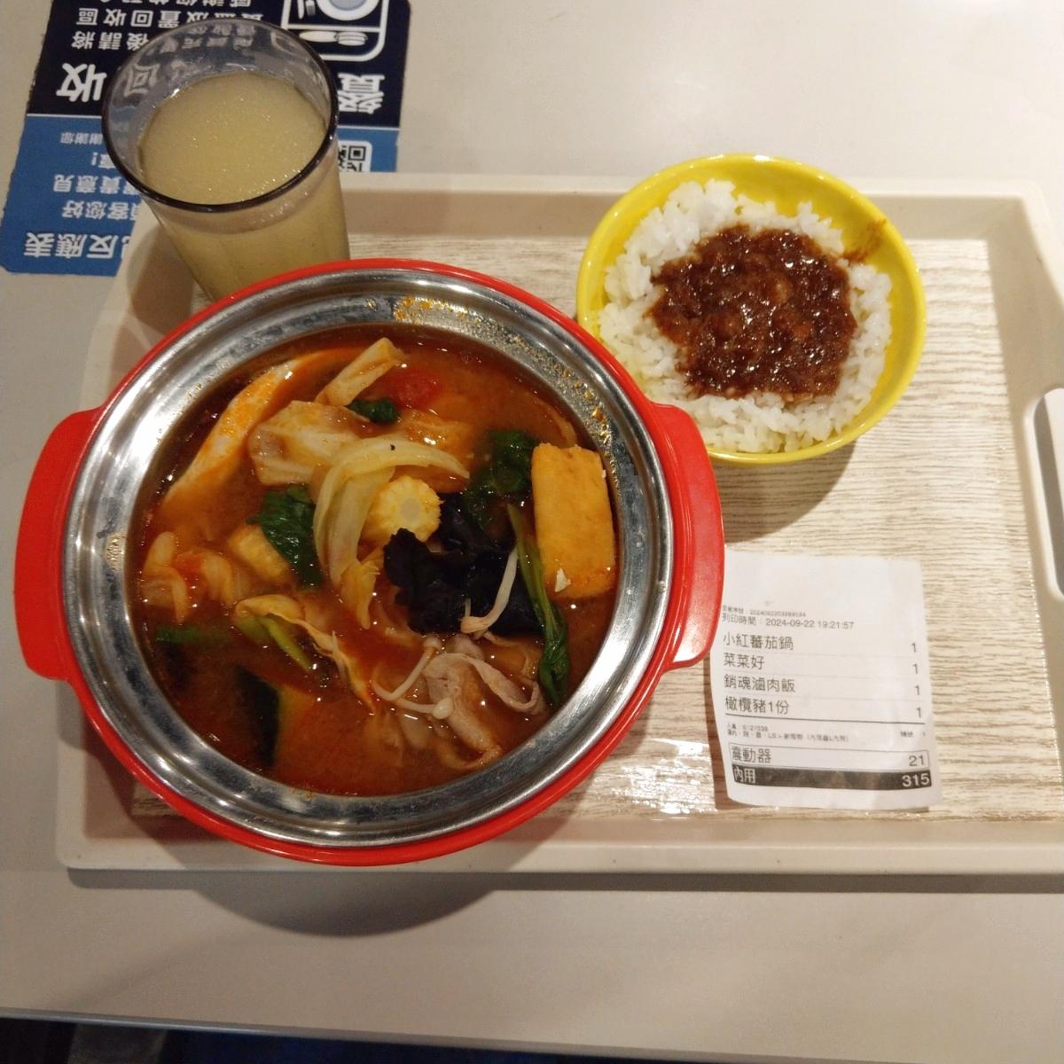 小紅番茄鍋:是濃郁的番茄鍋底,有番茄塊,甜甜的不會太鹹很適合小孩,蠻不錯的。肉品加價20元換成橄欖豬肉,吃起來口感比一般肉片細緻,但是蠻薄的,料底選菜菜好,非常多青菜(有木耳、菇類、玉米筍、地瓜),副食加價20元換成滷肉飯,但淋的量很少🙃超不推。