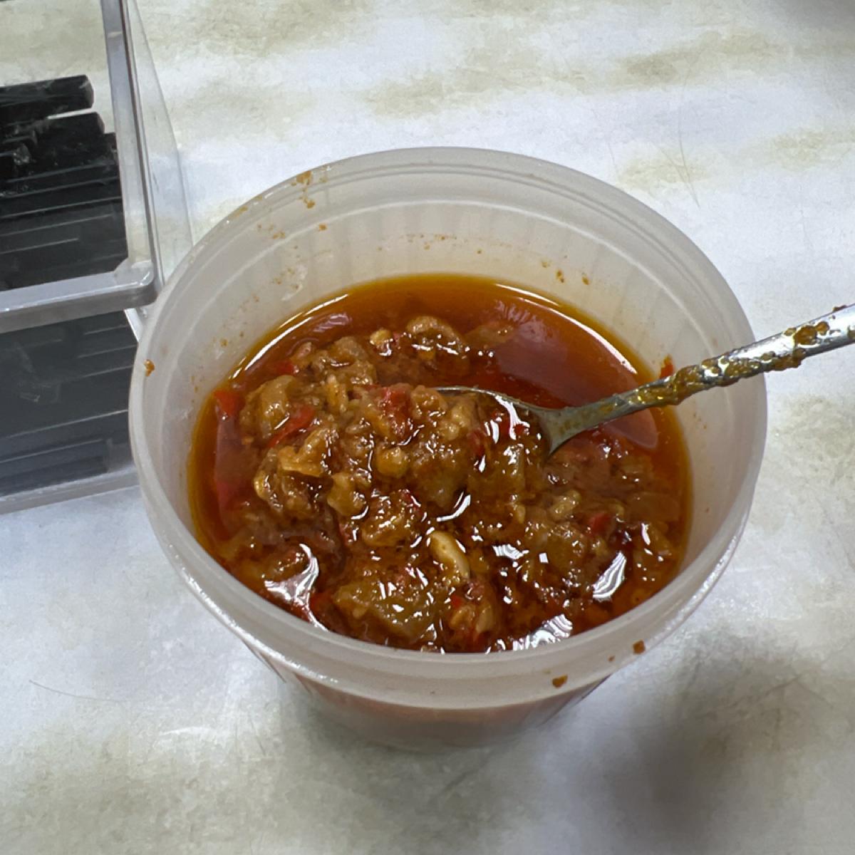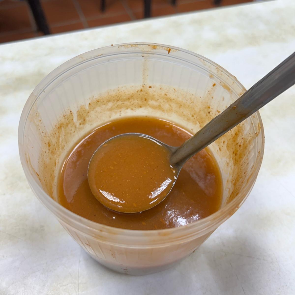 桌面上的醬料可自行添加,個人覺得這醬料才是筒仔米糕的靈魂所在,這裡給的醬料搭配起來還不錯,可以多加些。辣醬的部分就還可以,可加可不加。