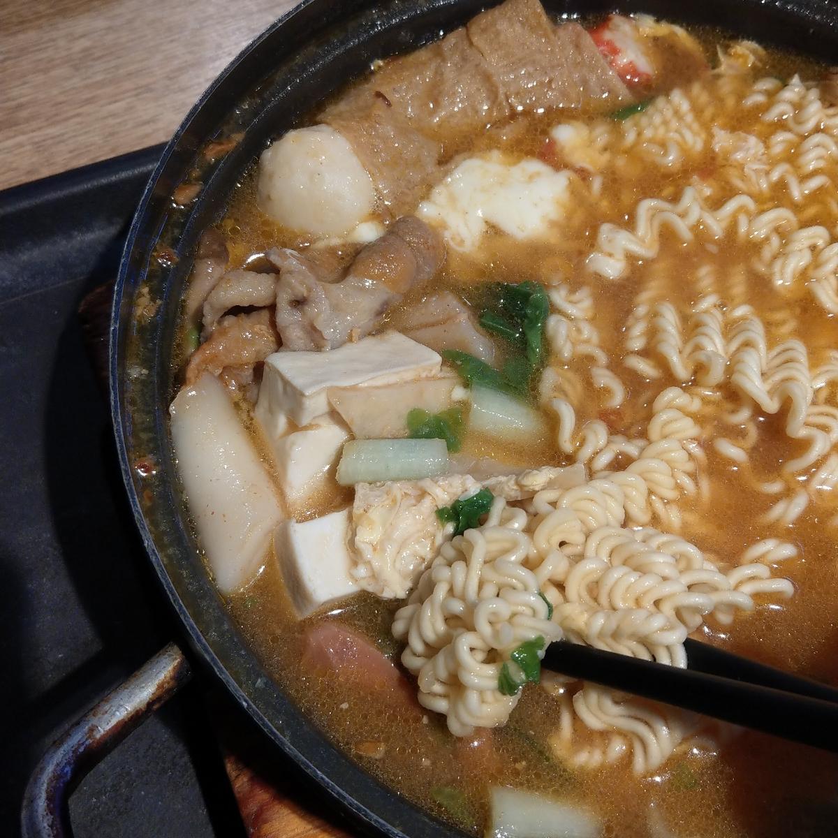 主食是泡麵,配料的部分和豆腐鍋相差不大,多了年糕和小熱狗,但湯底有個奇怪的味道,和以前吃過的部隊鍋不太一樣。