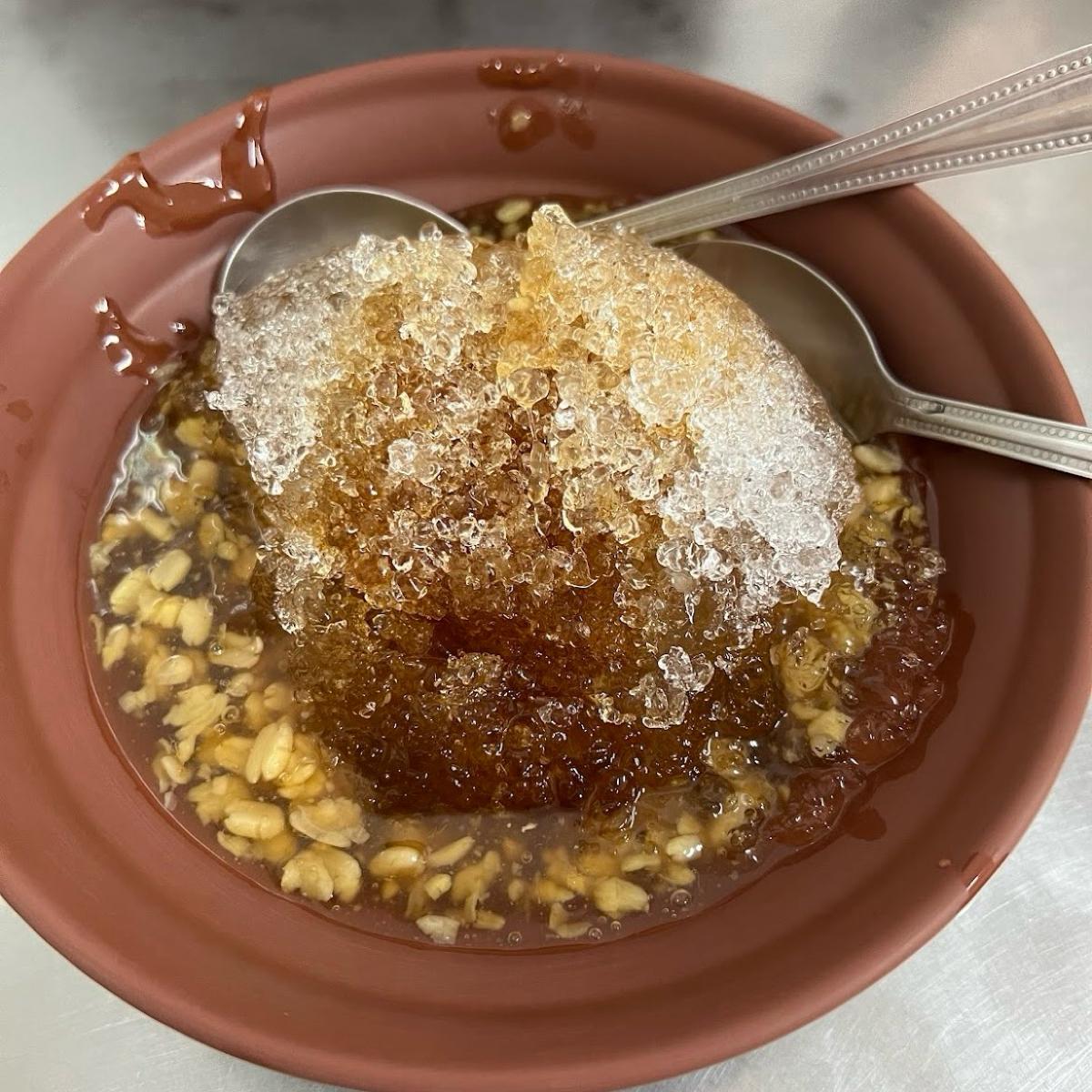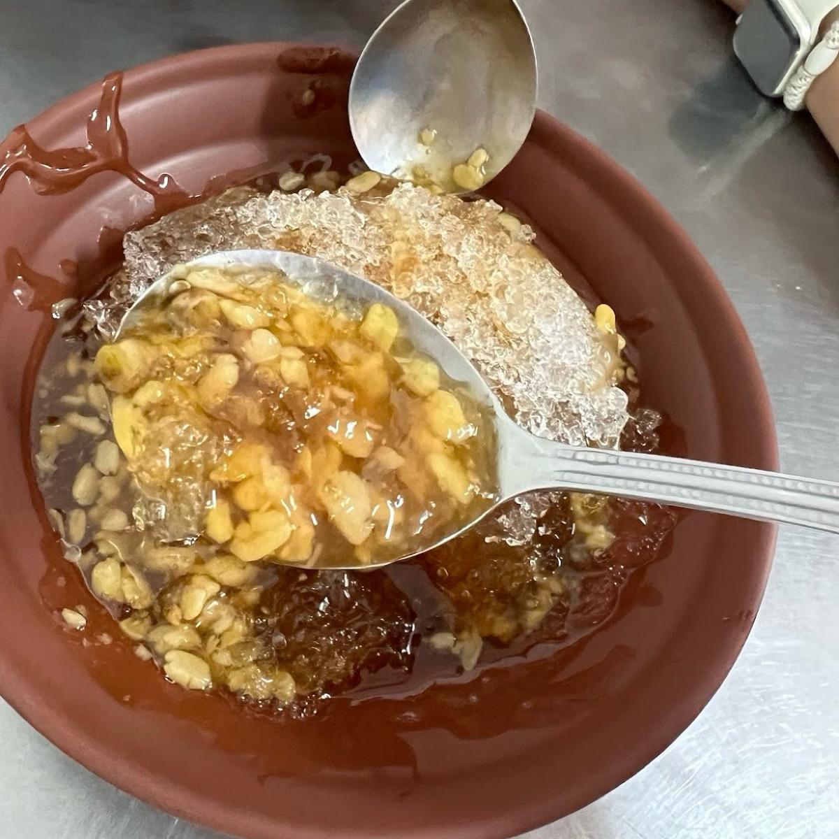 「阿伯綠豆饌」的招牌綠豆蒜冰整體口感清甜但不膩,帶有豐富的層次感。這裡還有熱綠豆蒜的選擇,對於在地人來說,熱的口感更為黏稠,能更加體會到綠豆蒜熬煮出的濃郁風味。不過,這家冰品的剉冰相對粗糙,口感偏硬,對於習慣吃細緻冰品的食客可能不太適應 。