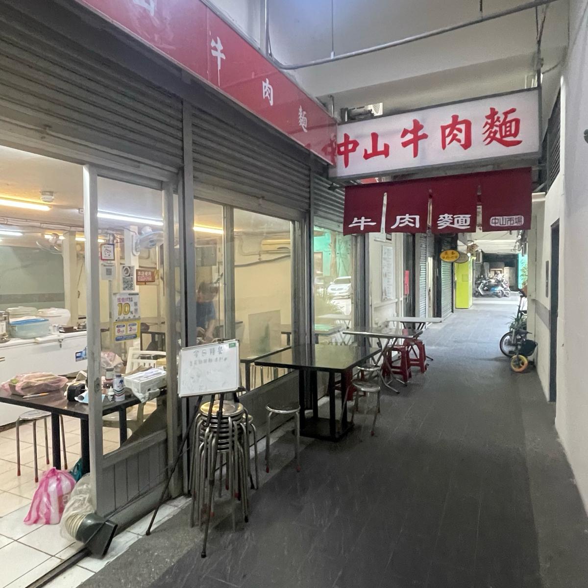 「中山牛肉麵」位於台北長安西路上的中山市場內的一個小店面,位在電梯旁,中山市場距離中山站和台北車站都不遠,如果從中山地下街R2出口走路大約3分鐘而已