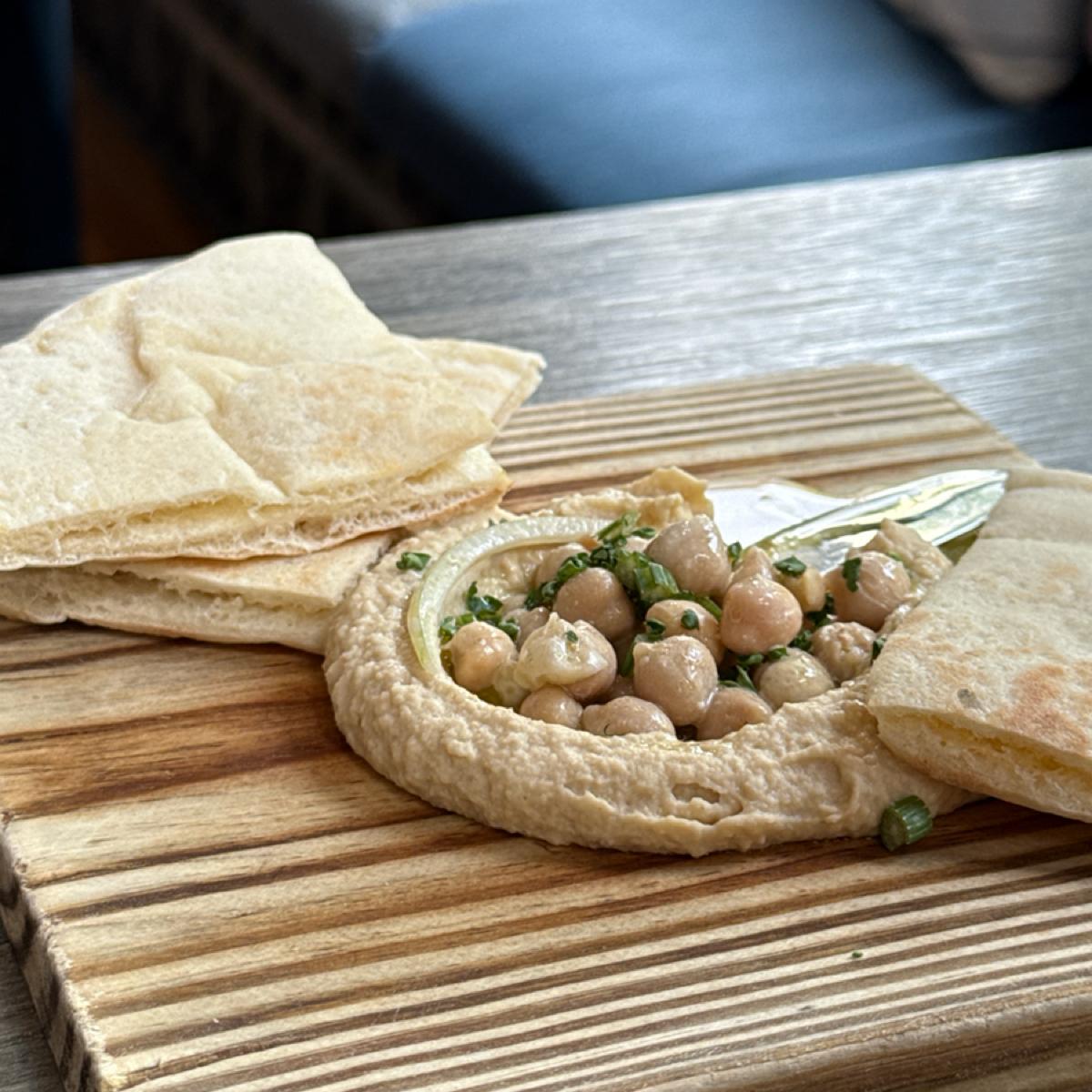 由蕃茄與洋蔥慢燉成紅醬基底,打入水波蛋後炆煮至蛋白熟、蛋黃微流,搭配自製烤皮塔餅與鷹嘴豆泥。整道菜色香味俱全,紅醬酸甜適中,洋蔥燉得軟爛入味,蛋黃與醬汁混合後濃郁滑順,再用餅沾著吃,非常有層次,鷹嘴豆泥本身滑順細緻,也為整體增加一種堅果氣息與飽足感。唯一小小的遺憾是,餅的份量不太夠,醬太好吃導致餅一下子就沾完了,後面只能用叉子挖來吃,有點不過癮,若能酌量多附幾片會更貼心!