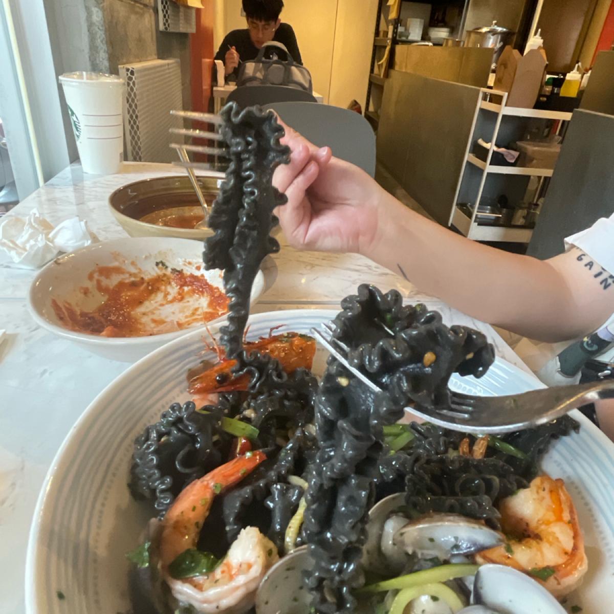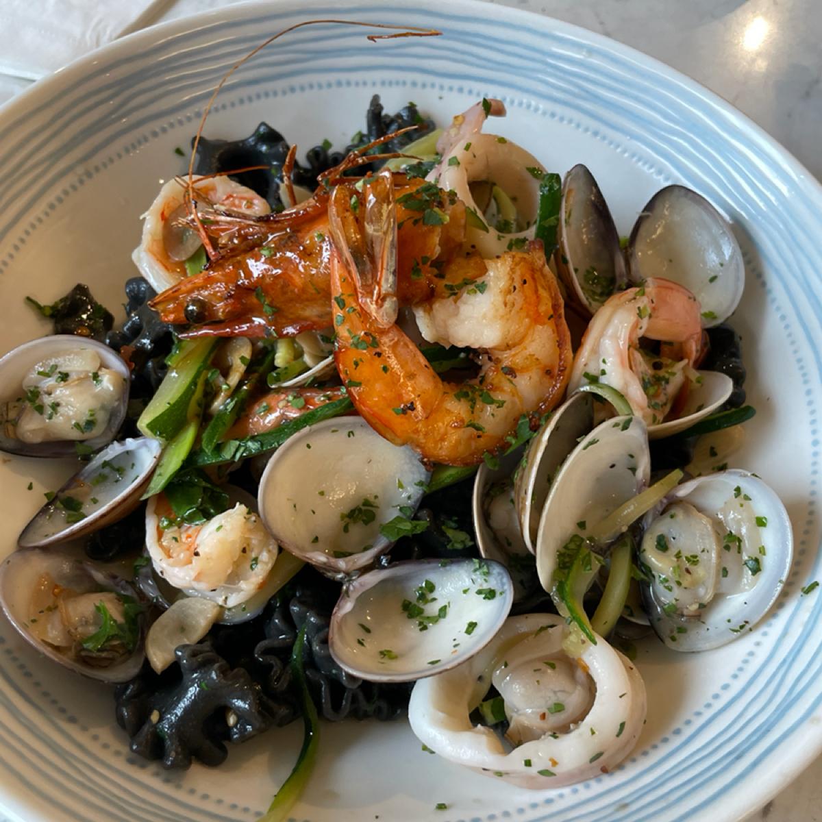 波浪麵一上桌就是濃郁的蝦味!麵本人超~捲,我第一次吃到這樣的麵體,確實沾了滿滿的醬汁!整道麵蒜、辣、鮮都很突出,但對我而言有點鹹。但他說因為主廚是義大利人所以口味比較重🤌🏼🤌🏼🤌🏼