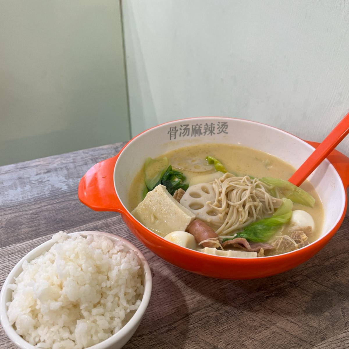 來一碗骨湯麻辣燙 白飯10元/碗、豬肉片35元、牛肉片40元 其他秤重計價,想吃什麼吃多少自己夾,選擇滿多樣的,火鍋料、青菜、還有不常見的大陸配料 湯頭是很濃郁微辣的豚骨湯頭,如果想吃辣可以再自己加青花椒(偏麻)、辣油(一點點就很辣),店內還有提供免費冬瓜茶蠻好喝的
