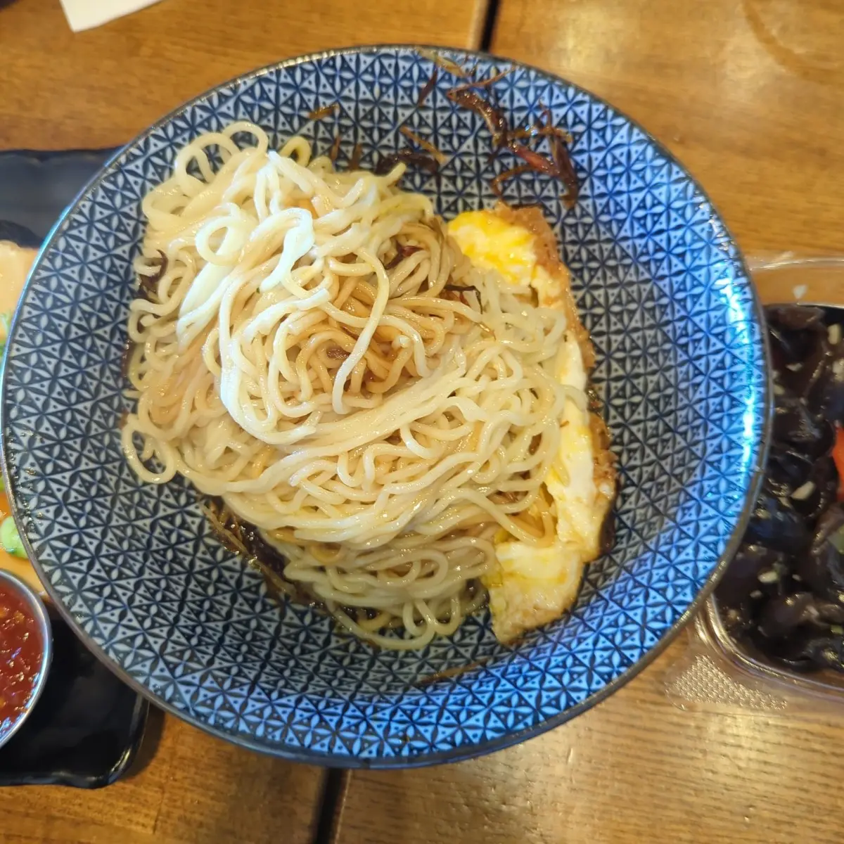 (3)眷村蔥油拌麵加蛋:細麵, 全熟煎蛋. 美味一如既往.