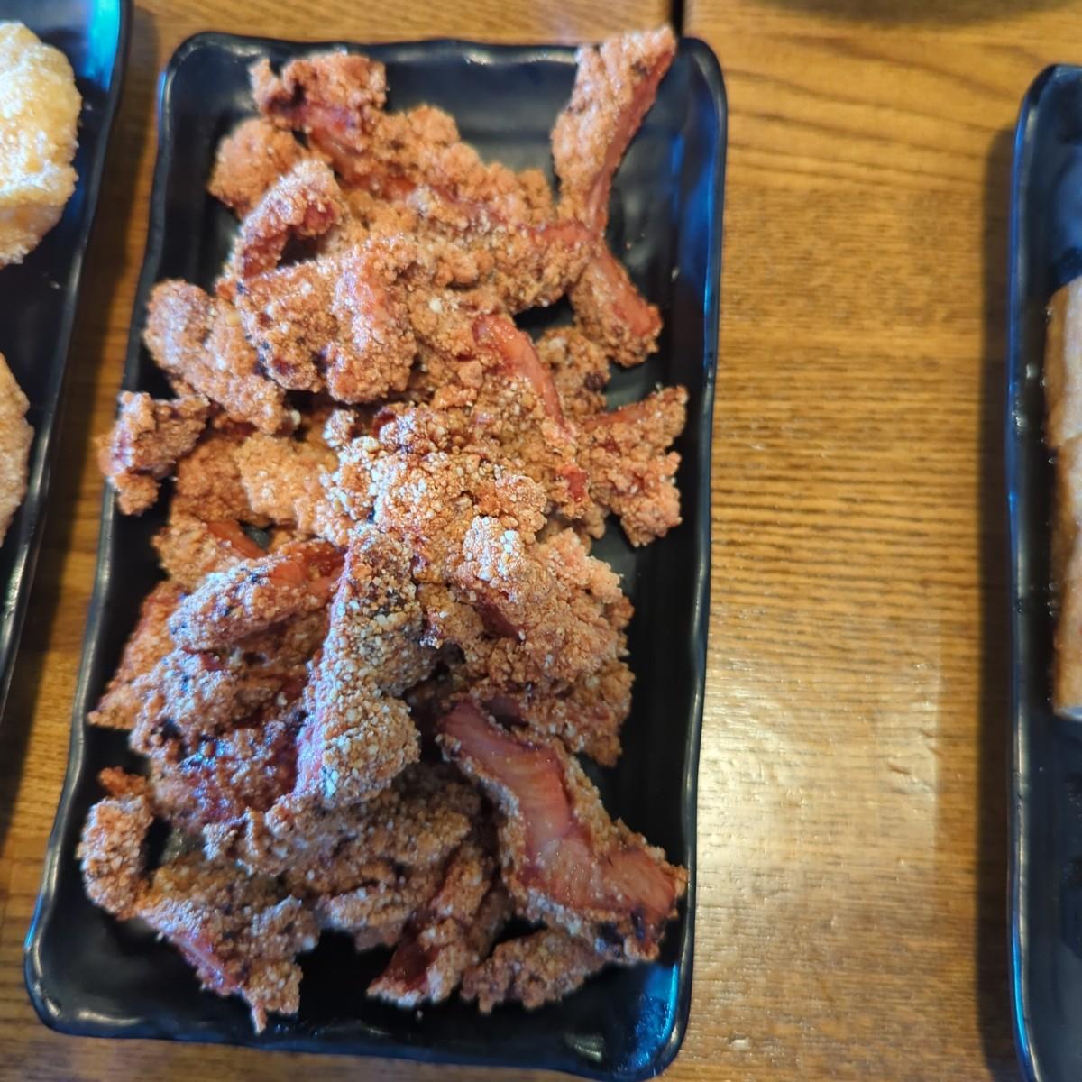 (5)(新)炸紅糟肉:炸得有些過乾. 這道菜最後上. 我們淺嚐幾口, 其餘打包.