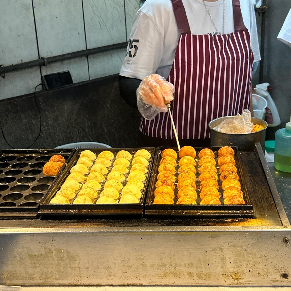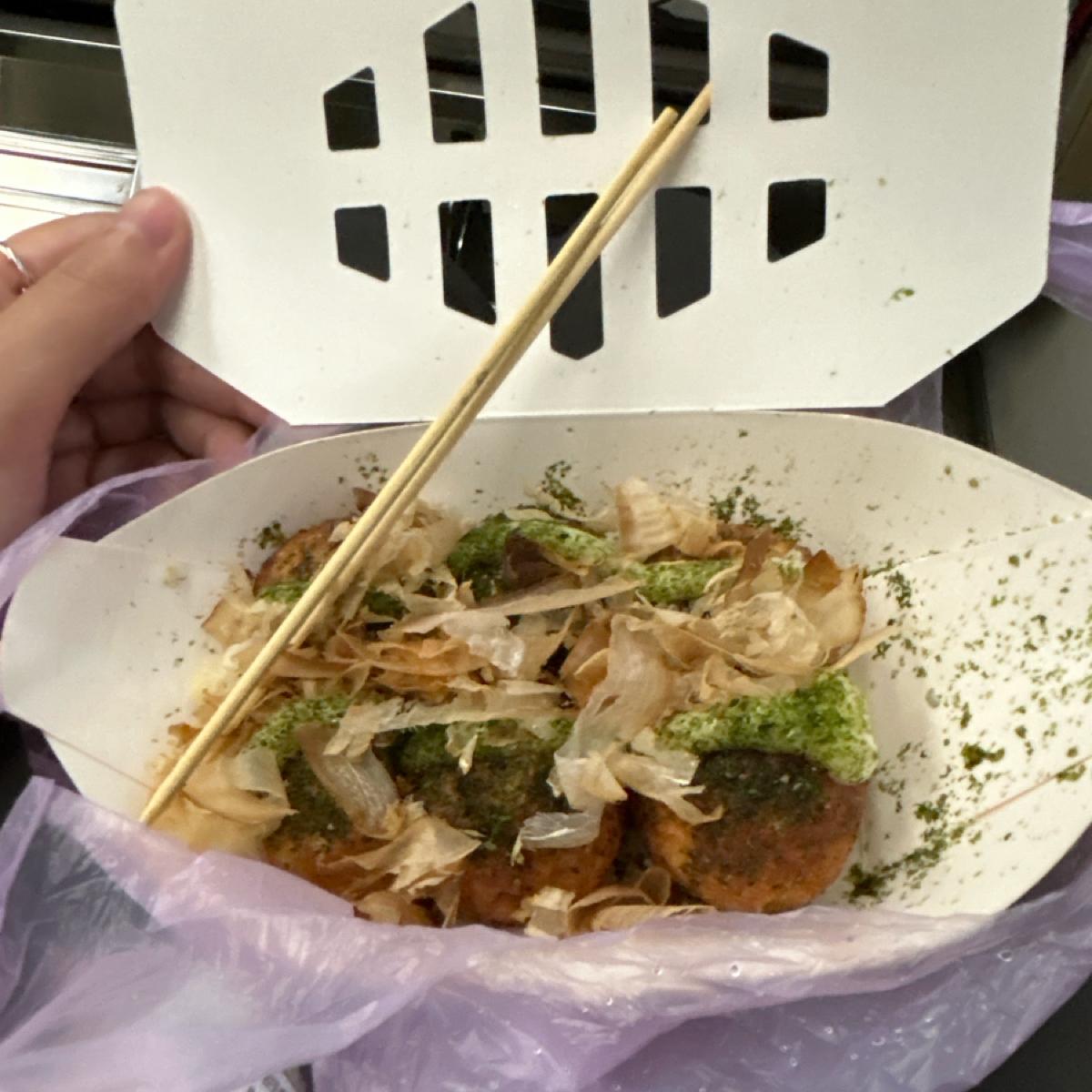 這間店雖然是連鎖日船章魚小丸子的店,但他們的菜單下面有寫著一行小小的字:「本店使用美洲魷魚」,所以我買的應該是魷魚小丸子(?