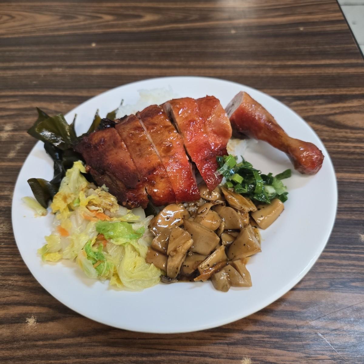 小菜是自選,我選擇了高麗菜、海帶跟黑胡椒杏鮑菇。