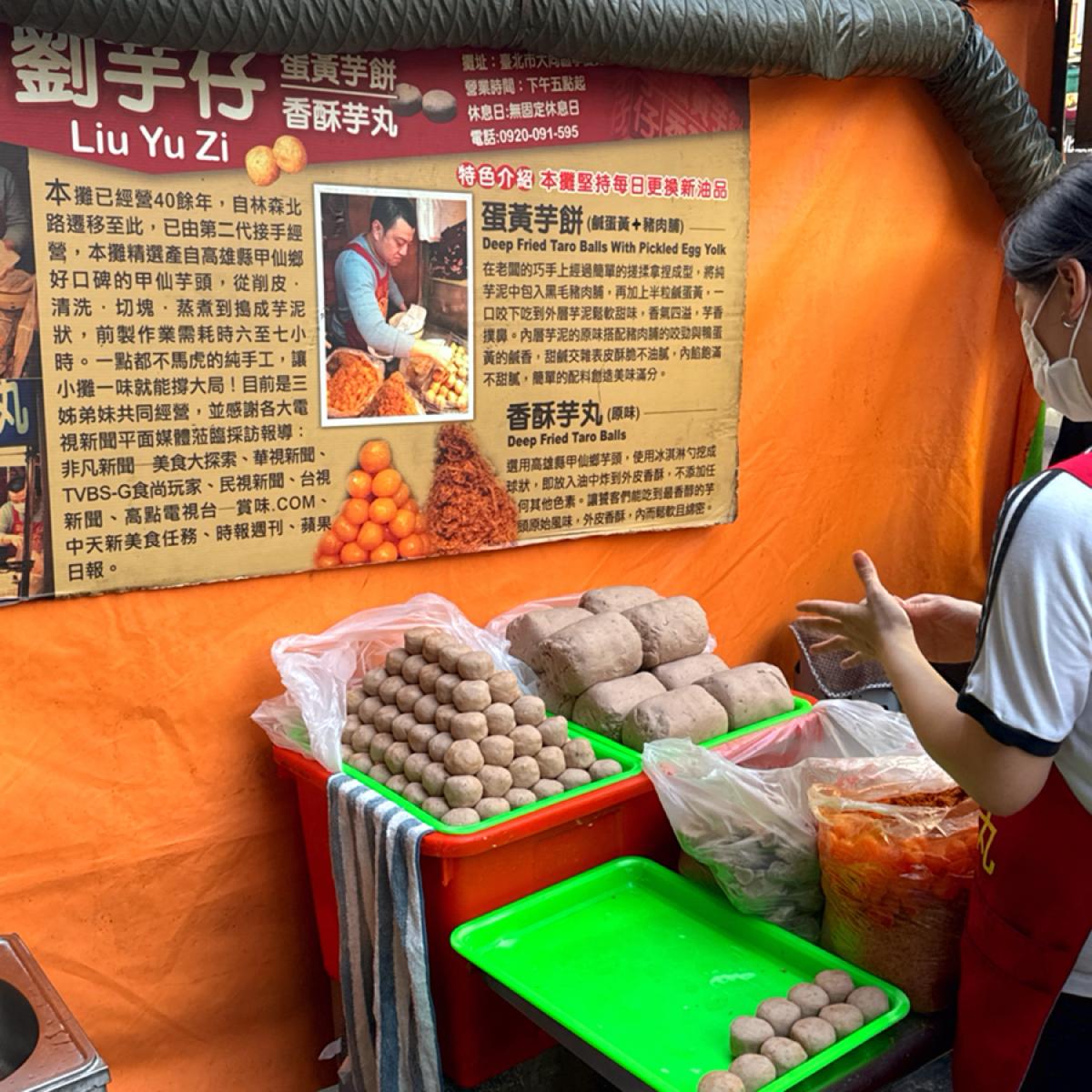 店家旁邊看板介紹,是選自高雄甲仙的芋頭,蒸煮、搗成芋泥後製成球狀,再炸至表皮香酥,而且很棒的是每天會換新油!
