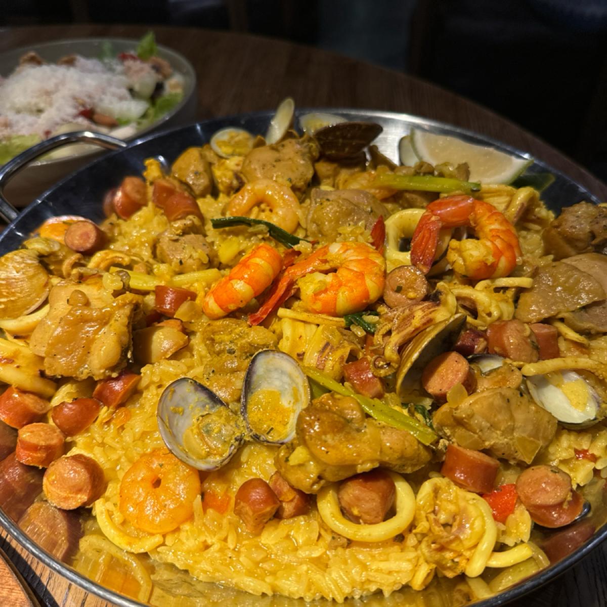 這次點了冠軍應援套餐,這是7/15-8/11期間限定的套餐,四個人吃綽綽有餘份量非常多,炸物拼盤很應景的提供五環醬料特色吃法,分別沾每一個炸物,超級好吃超級特別。燉飯裡面有滿滿的海鮮,香氣十足非常濃郁,搭配冰涼的精釀啤酒配著麟洋羽球,果然就晉級啦~~~~套餐發揮功效🤣