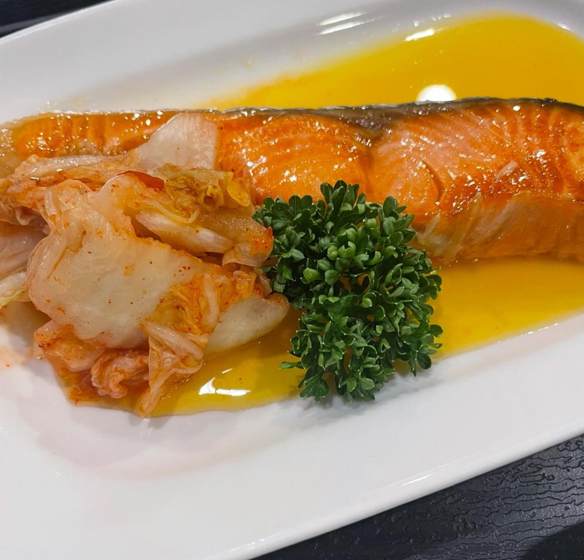 橙汁鮭魚的調味蠻特別,很少看到有店家這麼製作鮭魚,另外還有附上泡菜,也是蠻奇葩的搭配,我覺得還OK,但也不是很讓人驚豔的搭配。鮭魚的軟嫩度一般吧,覺得有點扣分的地方是沒有完全去刺,所以吃的時候要小心,個人覺得小麻煩