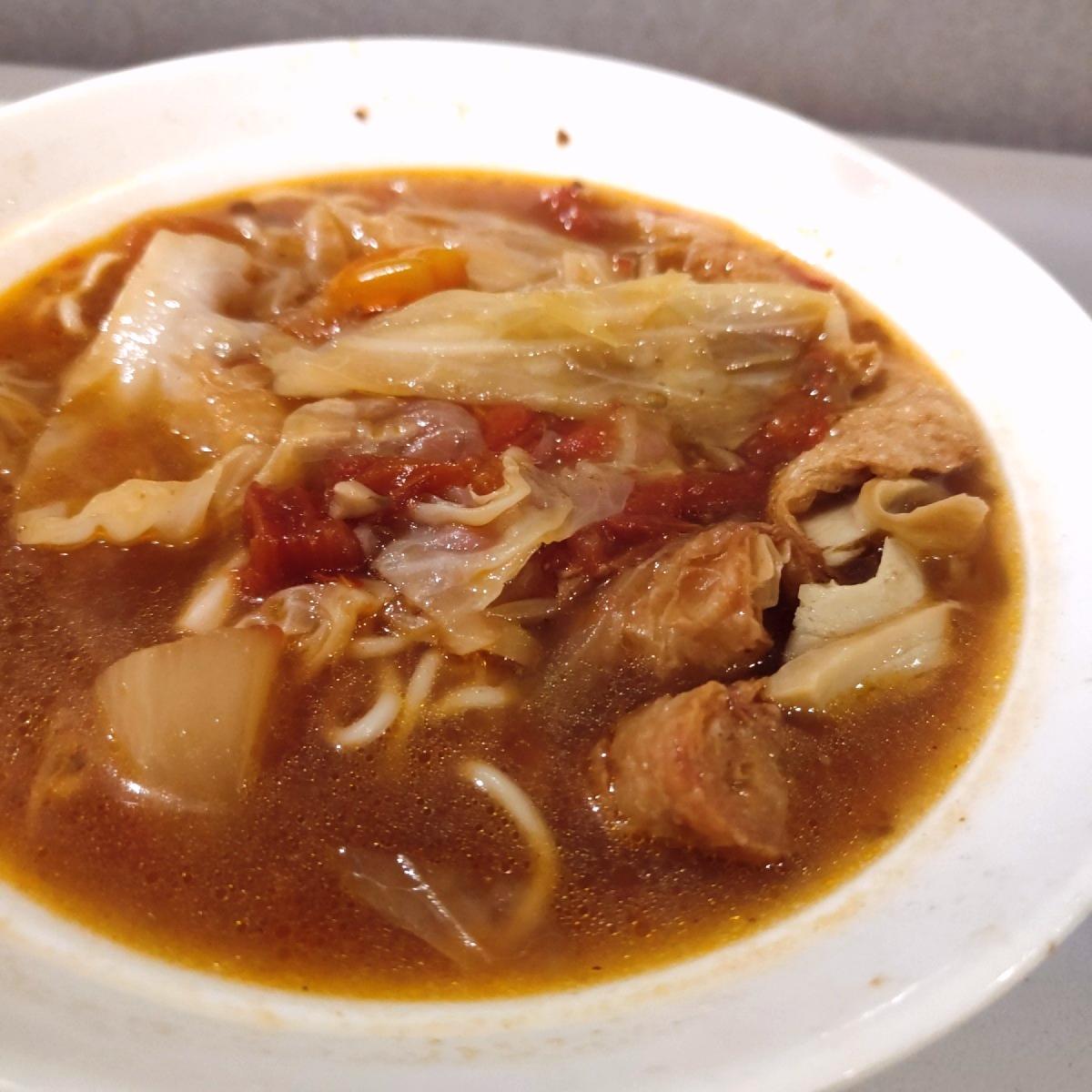 因為天氣有點涼,想喝點熱湯,就點了紅燒麵,紅燒麵的湯頭有加番茄,可以看得到番茄塊,但蕃茄味不重,帶點微辣(提醒一下:它的辣度不太固定,有一次吃到超辣),麵是油麵,我覺得煮的有點爛,配料有高麗菜、白蘿蔔、豆包還有一些我不知道的素料,整碗吃起來口味偏重,又有點偏油,但是是好吃的,份量也ok。