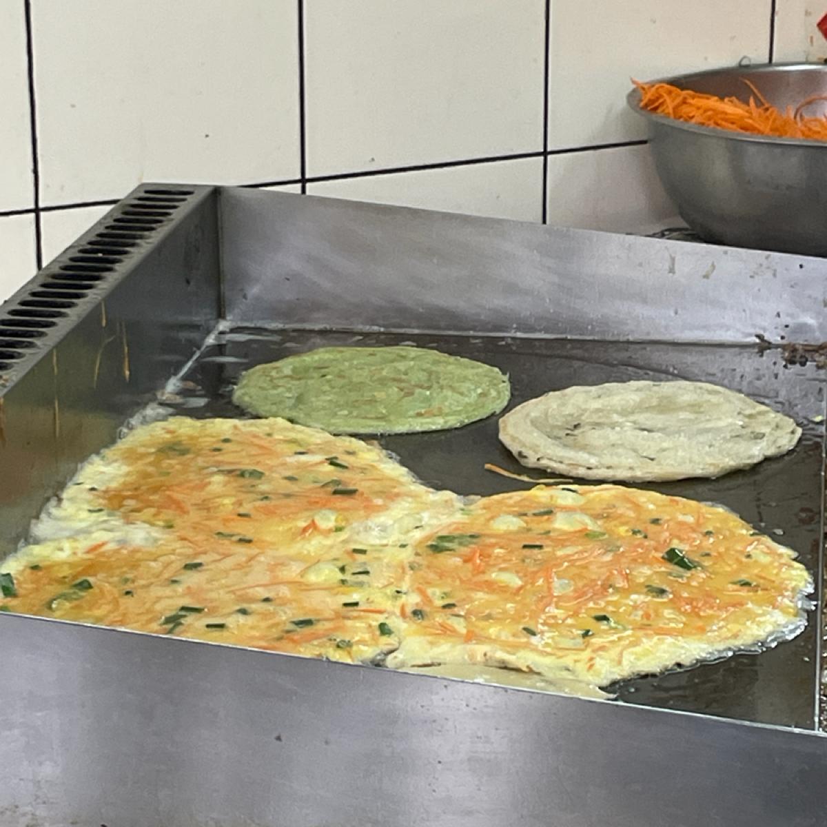也是在網路上隨便查詢到的早餐,在竹北仁義市場旁邊,沒看到什麼明顯的招牌,一到的時候已經在排隊了,本來以為有除了蛋餅以外的選項,後來排隊人龍前面的一位小姐人很好的告知他們只有賣蛋餅,光賣蛋餅就忙不過來了,餅皮有7種不同口味,裡面蛋加的配料都是一樣的,九層塔口味通常都是最快賣完的,真的很謝謝她的介紹,因為工作人員感覺忙到沒時間回答問題,看到阿姨放進去餐盒內之後都是客人自己在旁邊桌子上加調味料、包裝等等的半自助式,付錢也是直接跟阿姨說一聲放在桌上自己找錢。