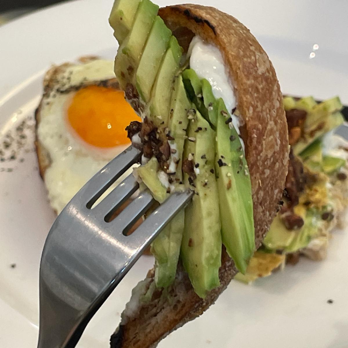 香煎酸種麵包抹上希臘優格、蜂蜜、乾番茄,鋪上滿滿的酪梨切片,撒上一點烤核桃,最後蓋上太陽蛋,盤邊佐一點釀造醋。