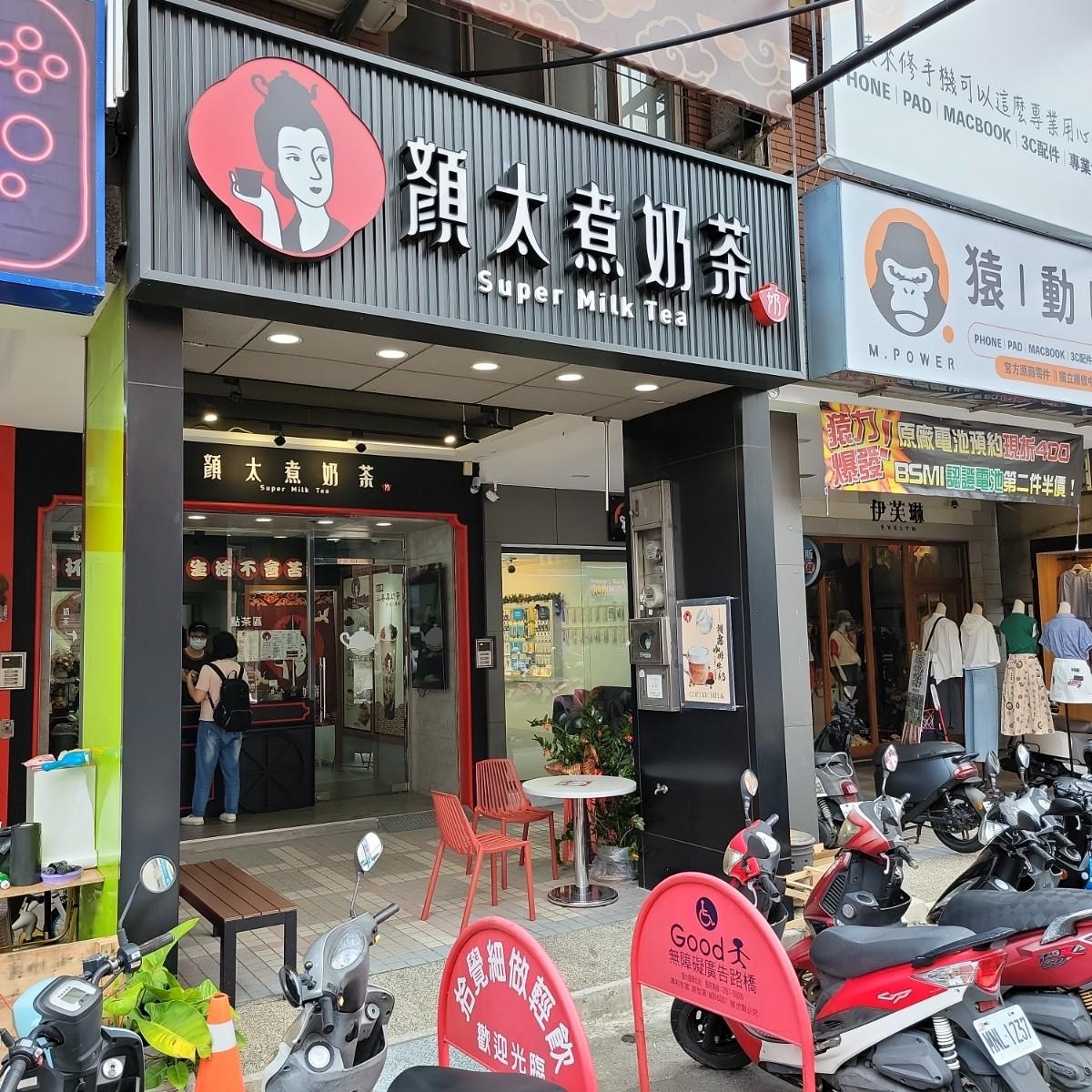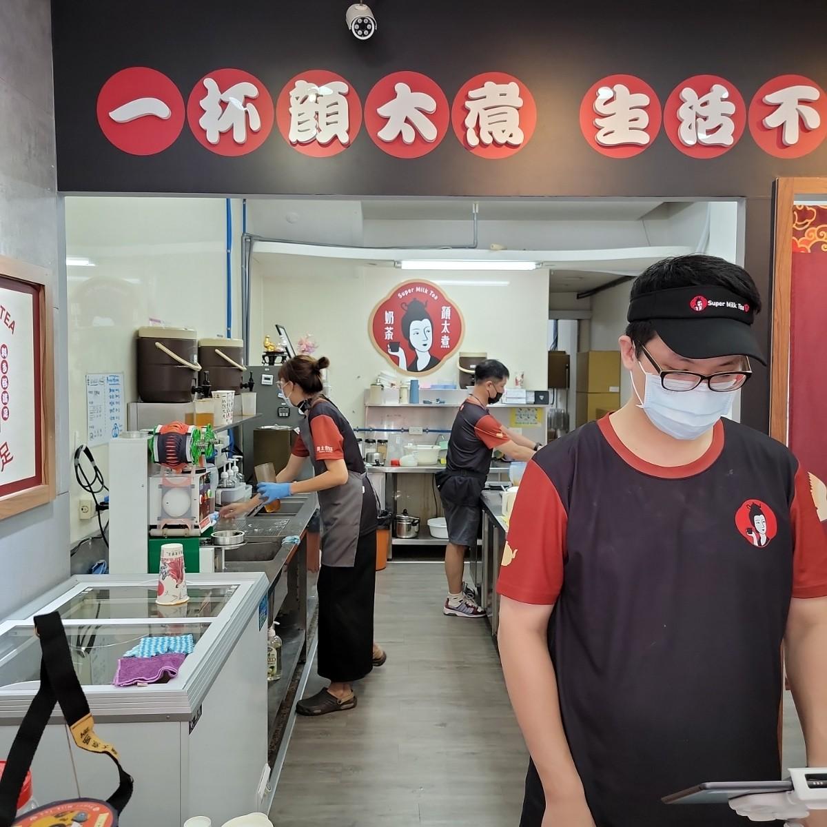 非常有特色的一家連鎖飲料店,店名就已經用了諧音梗,但是招牌下面寫的是Super Milk Tea我就不知道為何。整體色系採黑色系;Slogan是"一杯顏太煮,生活不會苦"。有做玻璃隔絕冷氣,留下一個點餐窗口。