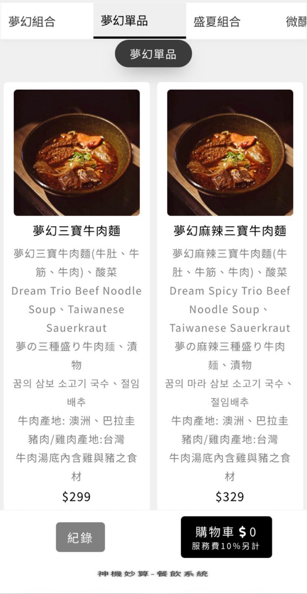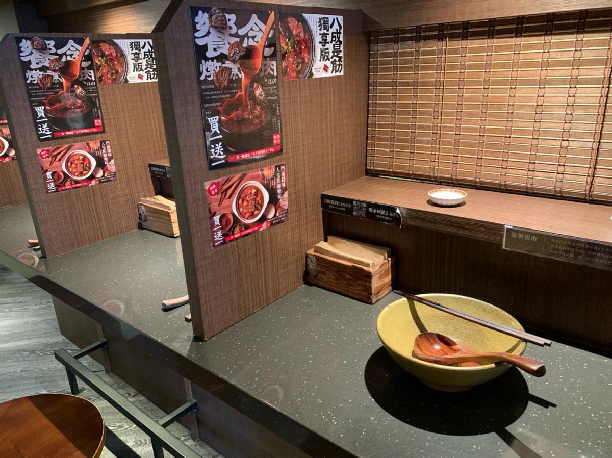 安排入座前,櫃檯服務生會索取手機號碼和姓氏,想來實在毫無必要,大抵又是行銷需求。入座後以QR code點餐,中英日韓語兼具,座位形式與一蘭拉麵相仿,單人座搭配前方竹簾送餐。點了最基本的「夢幻三寶牛肉麵」便要299元加一成服務費,算是中上價位了。可客製化麵條粗細(選了寬麵)、是否加入紅白蘿蔔與酸菜等。