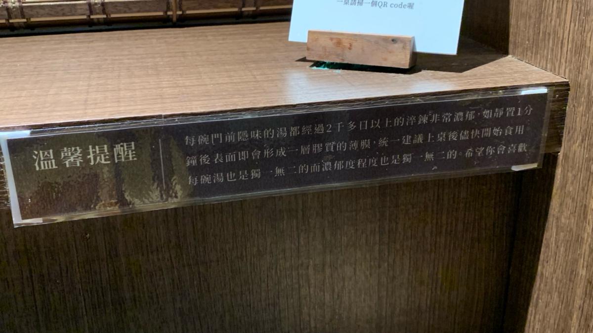 或許又是行銷需求,服務生打開竹簾送上來時,同樣要喊一聲「湯頭經兩千多日以上淬鍊」。