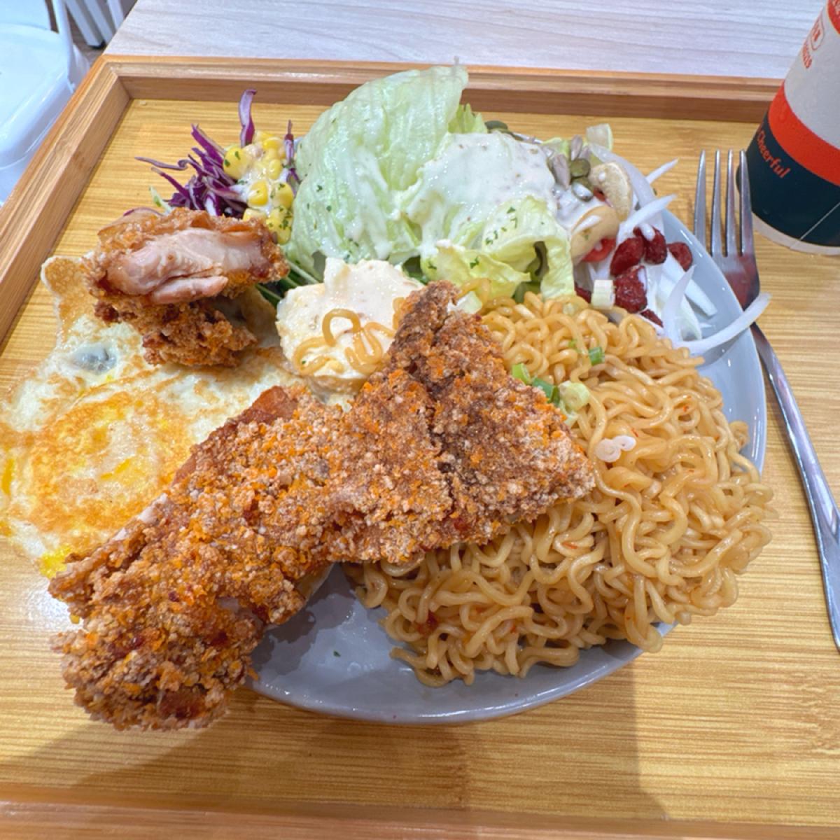 一上桌豐富度十足,大量的生菜及堅果,讓你膳食纖維滿滿滿,炒麵吃起來像印尼泡麵,口味不錯,而且煮得恰到好處不會過於軟爛,還保有麵體的Q彈,早上就可以吃到炸雞腿肉真的很滿足🤩,中式醃料加上地瓜粉,外酥內嫩,雞汁鎖在裡面,一口咬下會爆汁啊👍非常愛他們炸雞腿😘中間的馬鈴薯沙拉也蠻好吃😋如果蛋是半熟蛋就更完美了😍