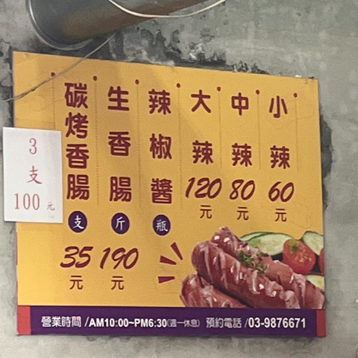 假日來訪 人潮絡繹不絕 要排隊但是不會太久 以前是開在媽祖廟旁邊 旁邊大馬路旁都可以停車 他只有賣一樣碳烤香腸$35 吃起來很香 碳烤的香氣 外皮烤的脆脆的 烤的色澤看起來很可口 咬下去還有肉汁 肥瘦比例剛好 肥肉丁吃得到但不會覺得噁心 還有附蒜頭 配著吃味道更好 也有辣椒醬可以沾 但忘記沾辣椒醬來吃了 下次有機會經過附近可以再來買 然後記得去媽祖廟旁邊買一下花生捲冰淇淋(個人覺得不輸頭城兩家名店 推