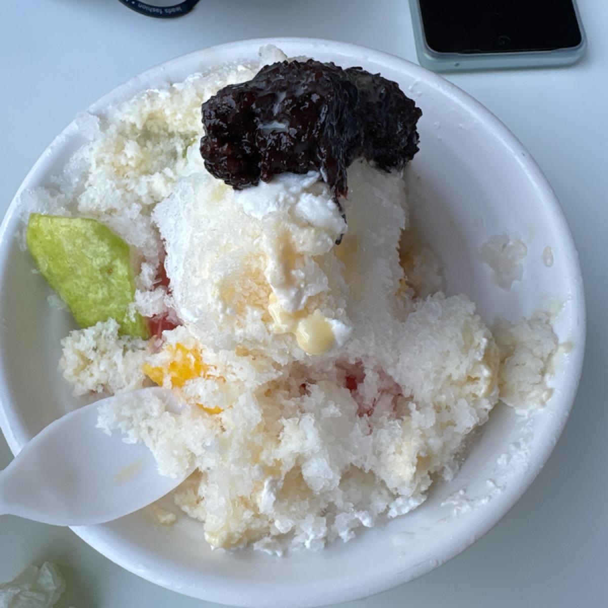 美村點頭冰,久聞大名,終於來到這裡了點了一碗招牌「點頭冰」,澎湃的挫冰,有淡淡煉乳,主題是南洋風味的椰奶、綜合水果(蘋果、芭樂、鳳梨等等)搭配西米露,還有最上層的紫糯米畫龍點睛,整體風味超級搭,消暑聖品,難怪可以吸引一個一個的客人前來,
