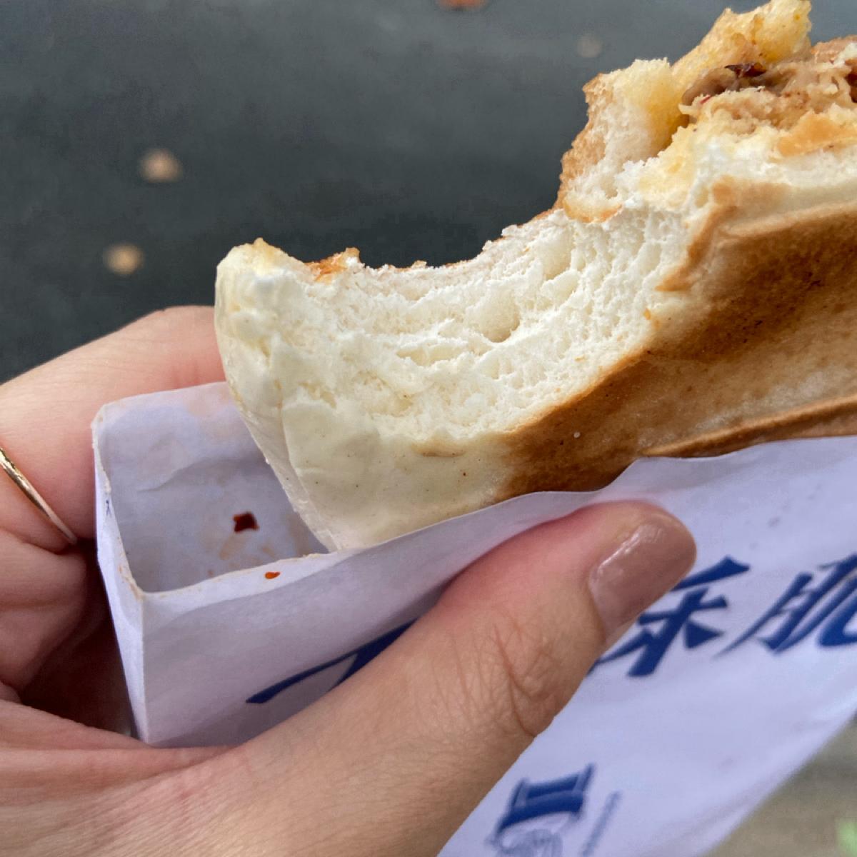一個人民幣9.9元的肉夾饃,相當台幣45塊又很大一份真的超級划算!一人獨享會非常滿足,但今天因為只是暫時止饑,所以兩人分食一個。
