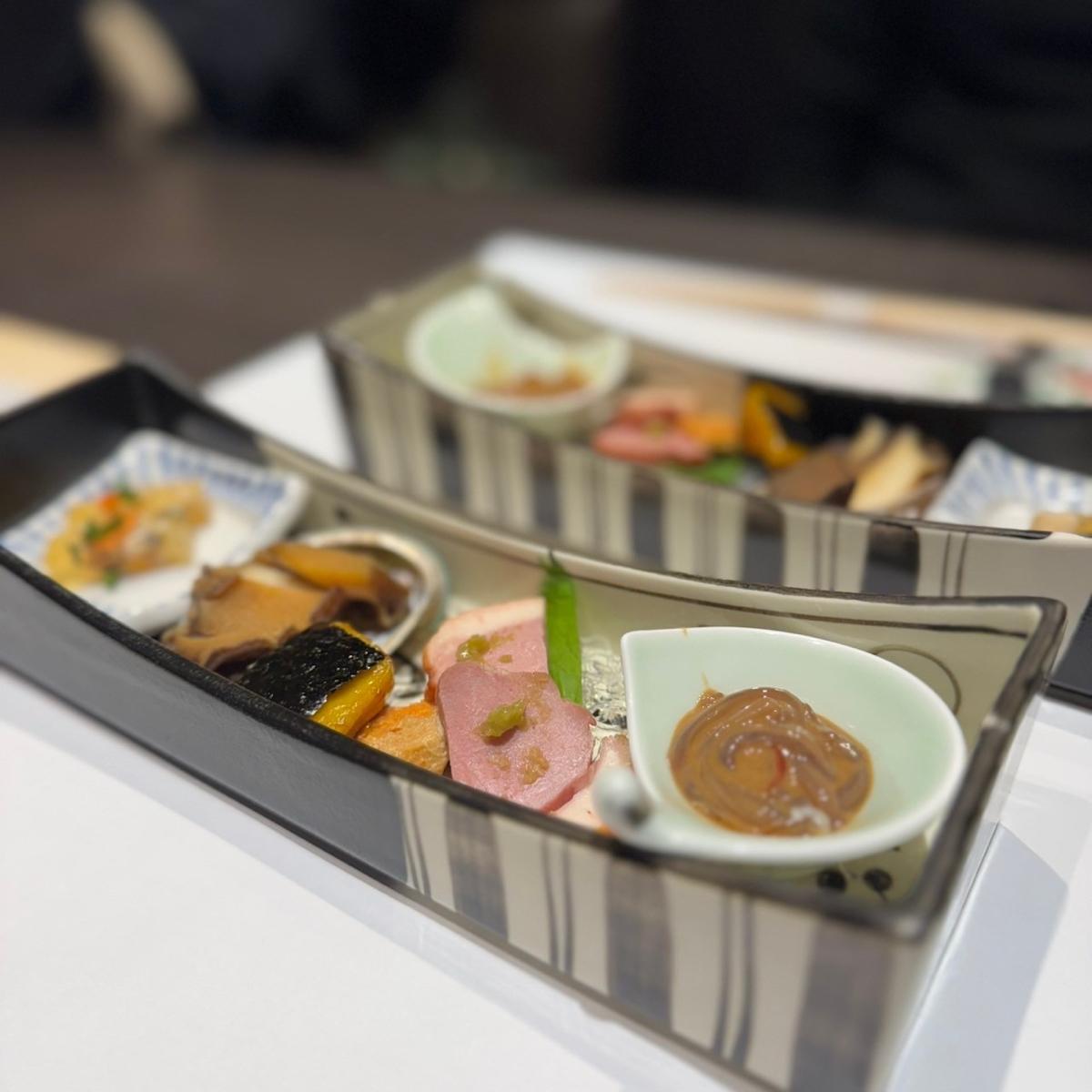 (河豚的煮涼凍、鮑魚海藻煮、磯部燒、肝醬西京漬、自製烏賊沖漬)