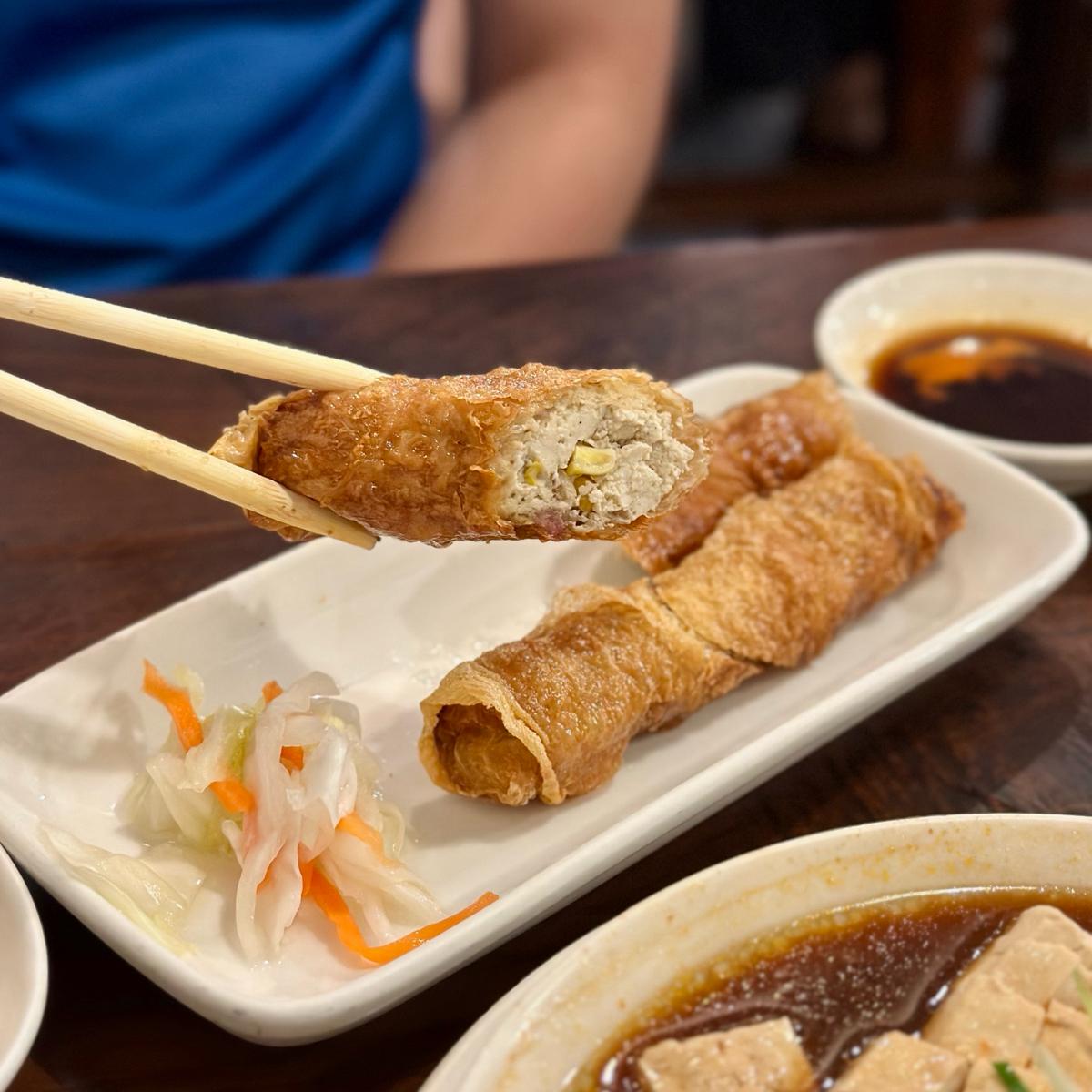 ✅招牌豆腐卷:外層麵衣薄脆酥香,內餡則融合了臭豆腐與洋蔥,口感豐富且帶有微脆的層次感,在口中能散發出濃郁的臭豆腐香氣。搭配一旁的小辣椒泥醬汁,微辣的刺激提升了風味層次,再配上一點台式泡菜,可以讓整道菜更加解膩。