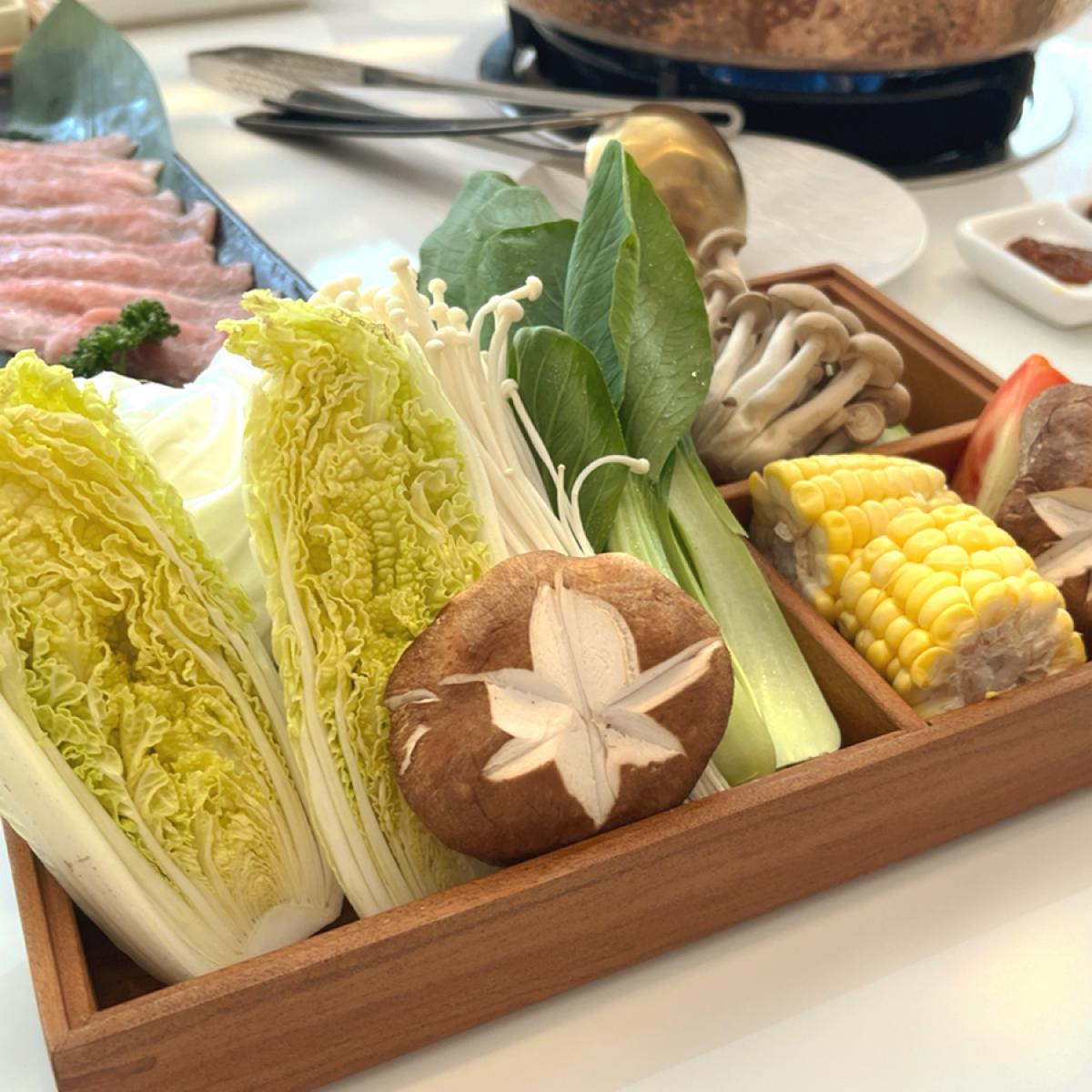 A5和牛是本套餐最大亮點,包含肩胛、肩三角、板腱與肋眼四種部位,肉質鮮嫩、油脂分布恰到好處,口感豐富。油脂較多,若食量小者或吃太快,容易感到膩口。建議可搭配店內提供的洋甘菊茶飲用,能有效解膩,比偏甜的烏梅汁和柳橙汁更適合搭配火鍋。