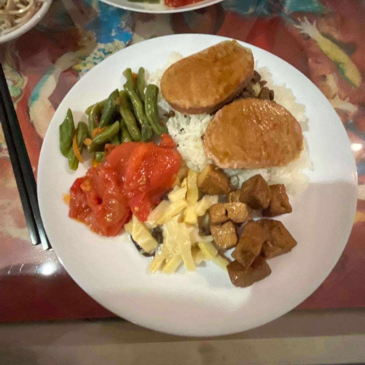 關於餐點 基本上滷飯只差在主食不同,招牌跟蜜汁的配菜也是相同的,蜜汁茶鵝有點太鹹,要配其他的東西稀釋一下味道,番茄味道明顯,其它配菜還算中規中矩 涼拌絲干,原本以為是是涼拌筍干,等到上菜時才知道自己看錯了🤣,這個剛好拿來配太鹹的蜜汁茶鵝,單吃吃起來清爽脆口