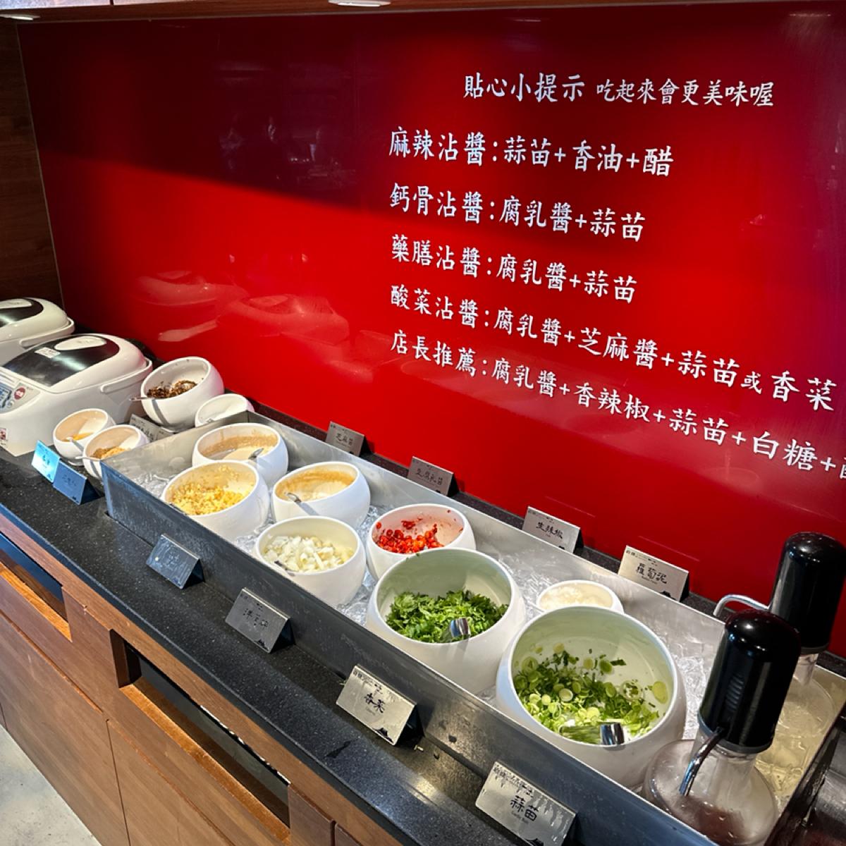 有【自助白飯】且【醬料區】的牆上有建議的配方,比較特別的是有腐乳醬跟芝麻醬,感覺是店家自製;沒有沙茶但有醬油。