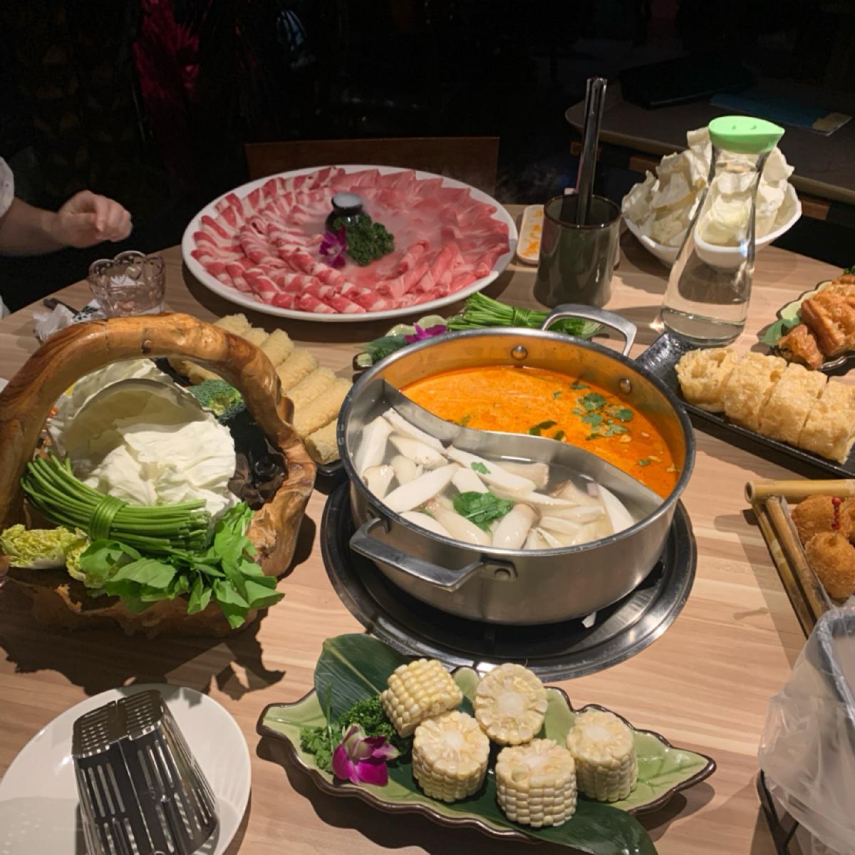 鍋底我很喜歡冬蔭功,濃濃揶奶味帶點微辣很道地,泰奶塔一上桌真的很吸睛,但它的甜度連螞蟻人的我還是得加半杯冰塊🧊泰拳蝦餅如朋友說的美味必吃,相對之下肉品是新鮮的但沒特別厲害👍玲玲卷跟豆皮吸飽湯汁後變得很好吃。