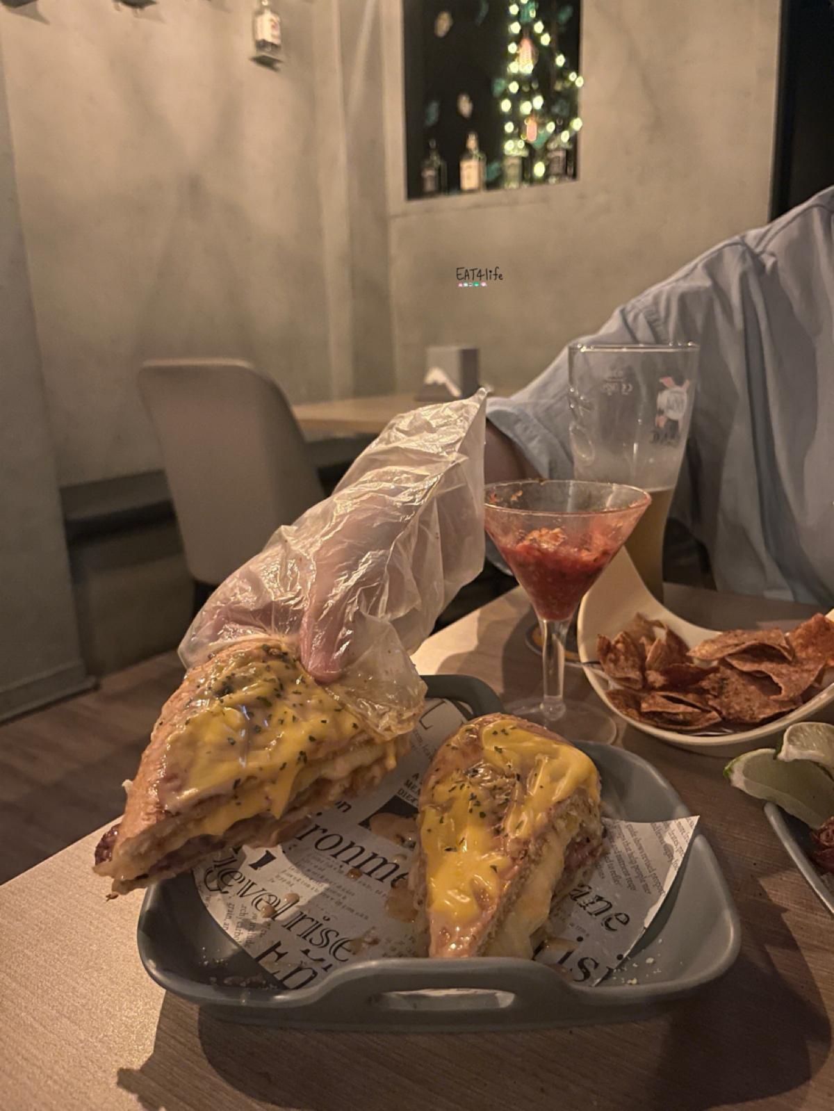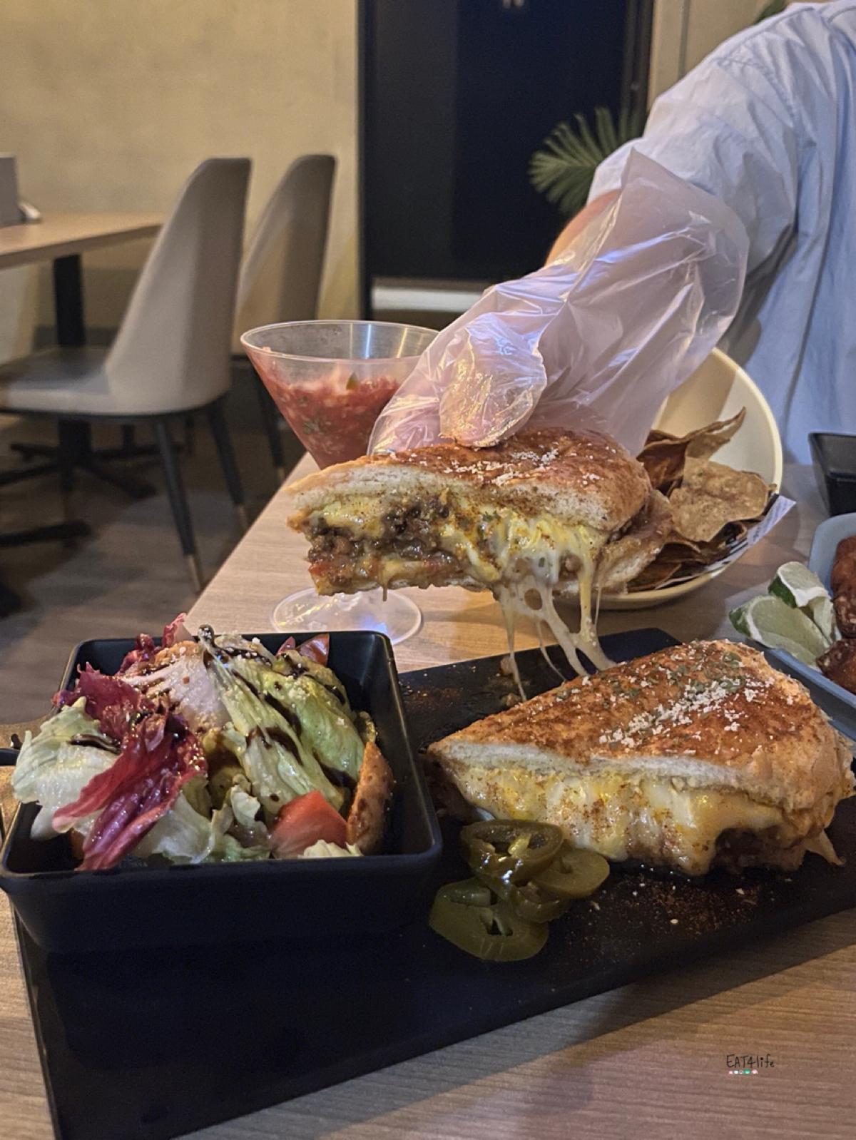 這個古巴三民治我們吃的是套餐,有附沙拉、莎莎醬玉米片和任選100元內飲料,古巴三明治的口感超級酥脆,裡面是滿滿的起司和肉醬,兩者融合再一起,再加上一些辣的香氣,非常清爽好吃!