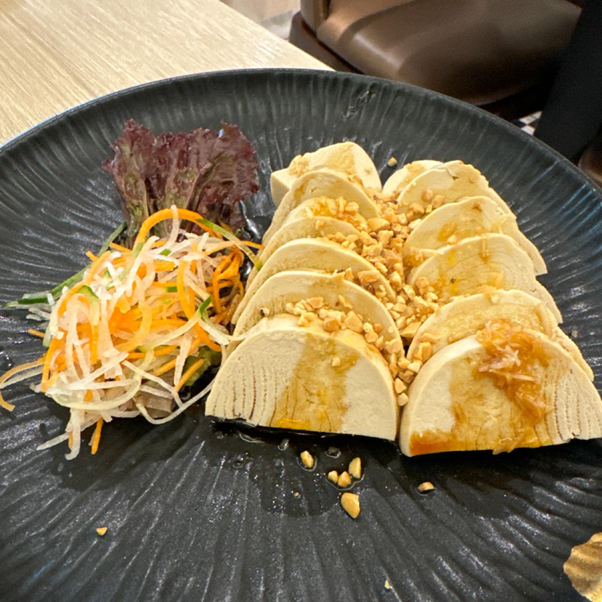 -川味口水G-190-它的口感比較像素雞捲或是百頁豆腐,吃起來冰冰水水的,稍微有點彈性但不是素肉的口感,與真正雞肉口感也不像。醬汁的部分下面有醋的微酸,與花椒油的麻,上面有薑泥與花生碎。整體調味還是不太像口水雞的感覺,比較中規中矩。