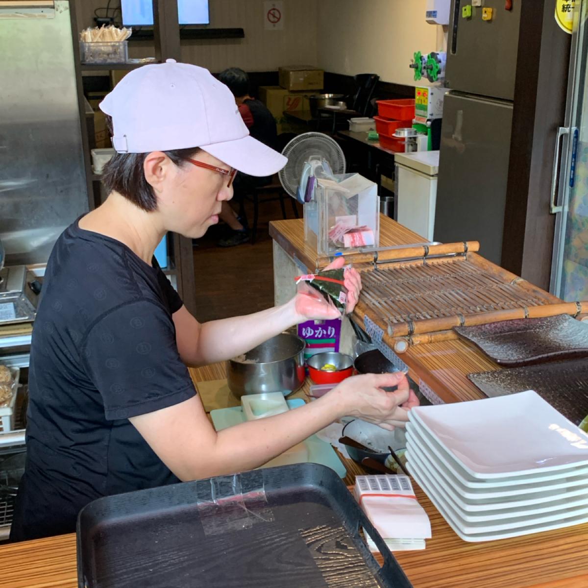 店家現做速度很快,與超商三角飯糰形式相同,納悶差別是?份量更大,且能吃到飯糰熱呼呼,及早食用才能有脆口海苔,否則要濕潤了。