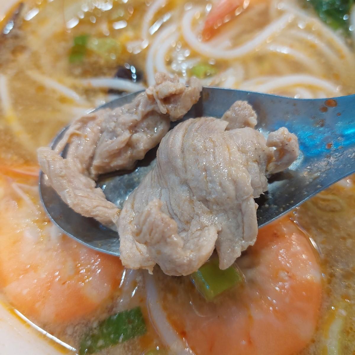 超級豪華的配料內容有三個魷魚圈、三隻大蝦、三片里肌肉,還有豐富的蔬菜跟木耳。
