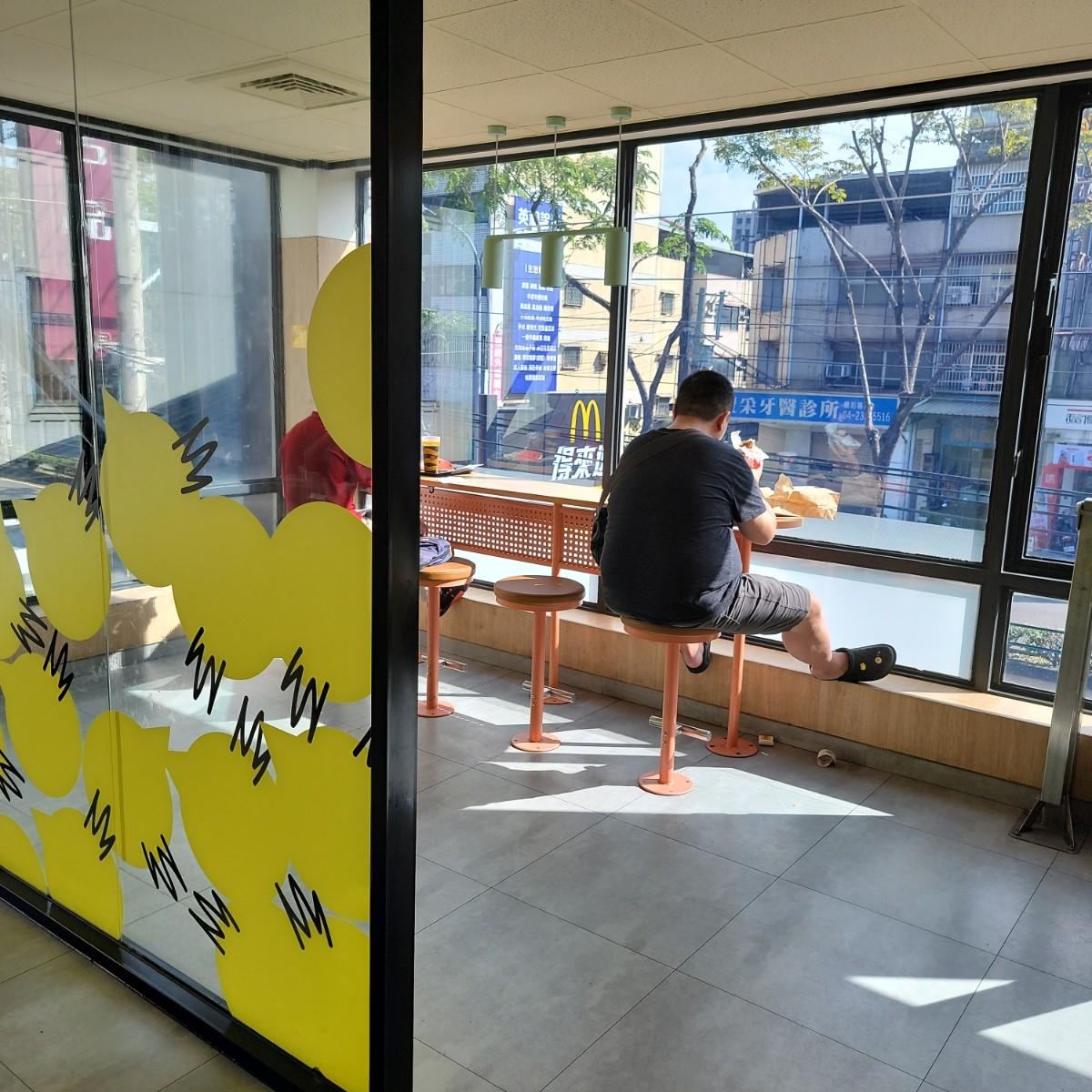 這邊因為有學校的關係,形成了一個商圈。麥當勞外觀一樣採用近年來的黑色系,得來速點餐車道裡面有大約6個停車位,但是車道就在旁邊,角度要抓一下不然不太好停;並且車道龐有電線杆,轉進去的時候角度要抓大一點不然容易撞到。裡面大約有四台自助點餐機,1、2F用餐區;沒有電梯。