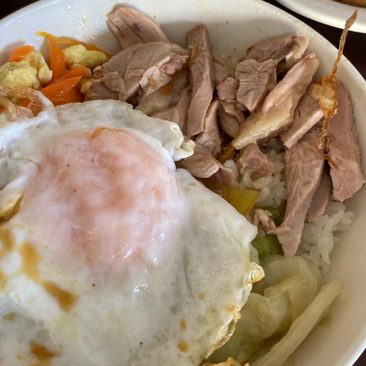 我點了火雞肉片飯含三菜,火雞肉片的肉比較大塊,吃的很爽,加上三個菜才$85很划算,而且份量很多,菜量也不少,淋在雞肉的醬汁又油又香,搭配起來是絕配,讓人一口接一口就吃完。本地人推薦加顆荷包蛋,微微半熟蛋,稍微用破,蛋汁拌著飯更是加分。