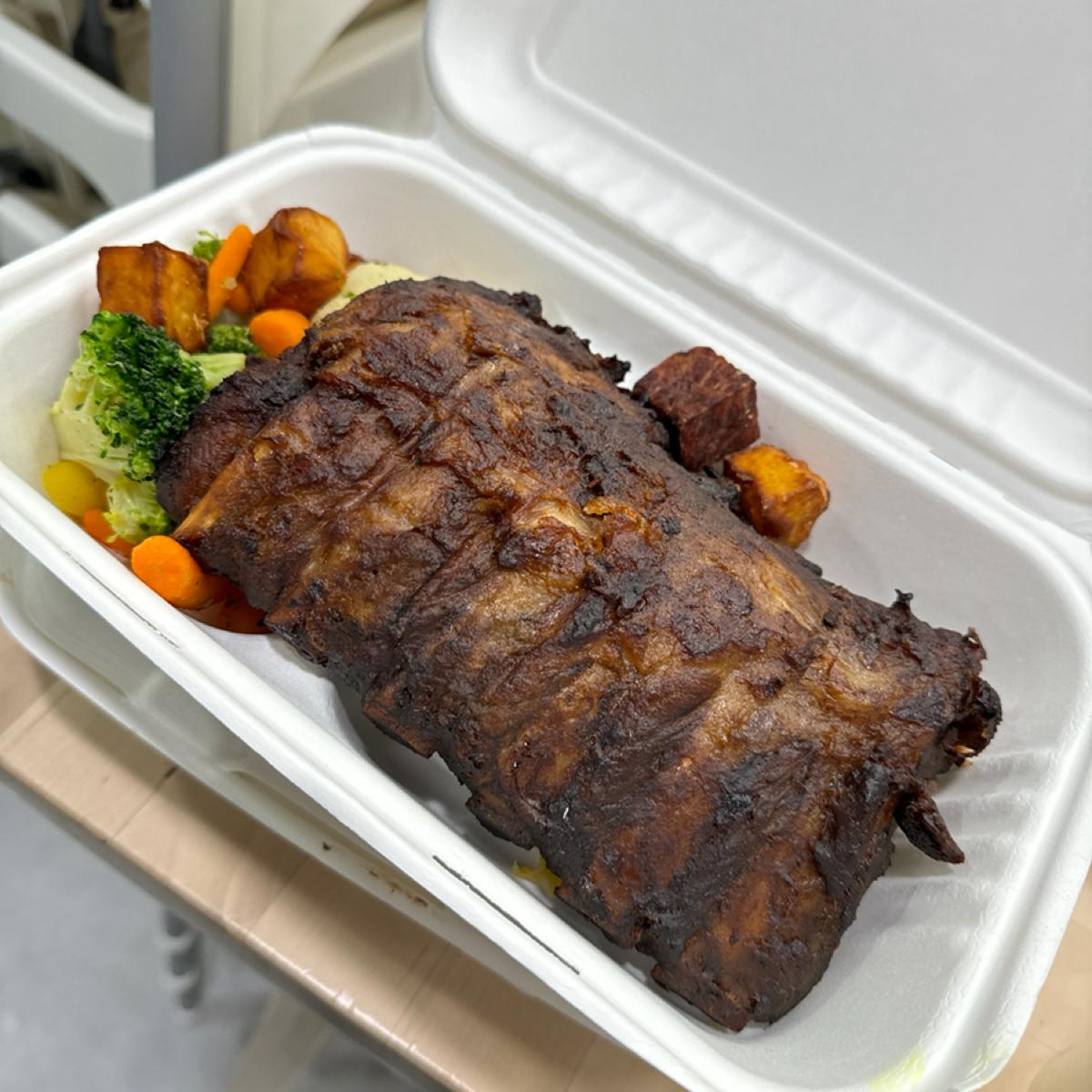 -蜂蜜醬烤豬肋排佐雙色地瓜-389-肋排非常嫩,切下去馬上骨肉分離,帶有些許美式香料的味道,可能些許乾一點不過還可以,旁邊配的除了一般無調味冷凍蔬菜以外還有片狀的黃地瓜與一款烤地瓜。這款方型烤地瓜就好吃許多,外層會酥脆裡面比較香甜!