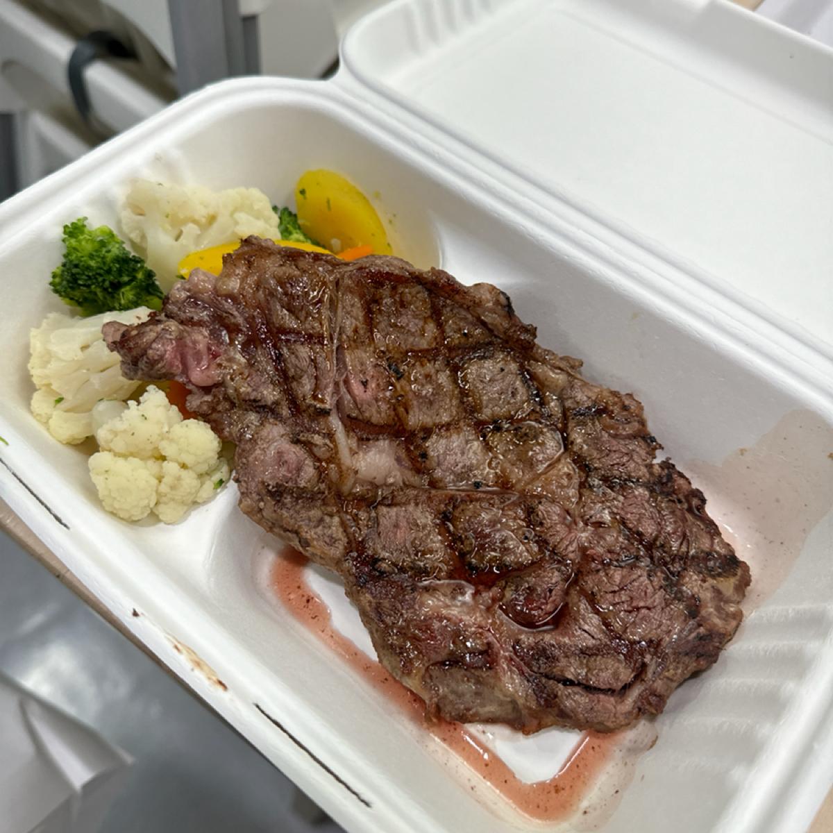 -肋眼牛排佐芥末籽醬-389-牛排本身厚度是比較薄片的,大約七八分熟,吃起來滿好咬的,肉質還可以,牛味不算特別重。旁邊配的是一般無調味的冷凍蔬菜。